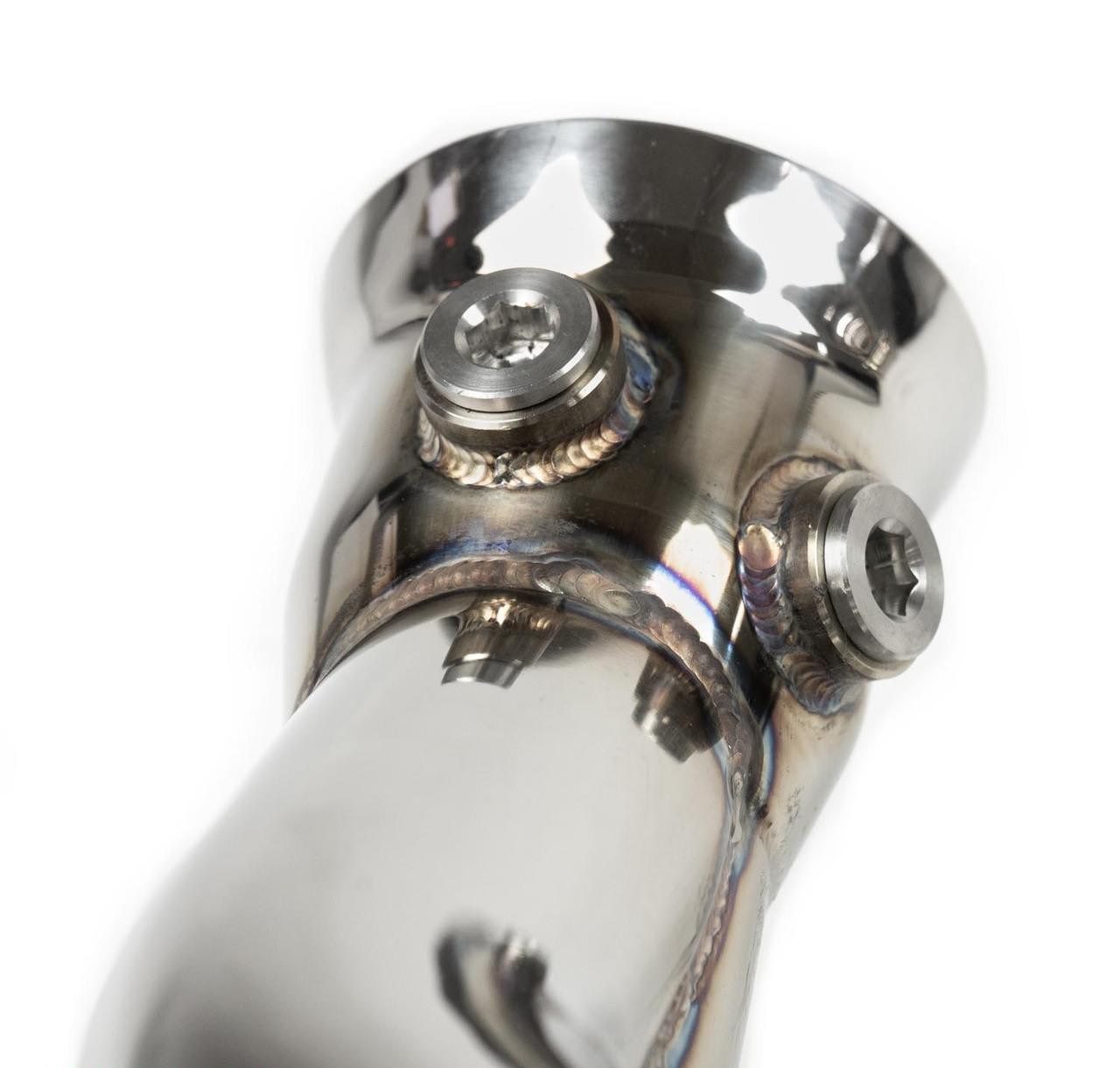 • Fabspeed relocated of the O2 bungs from the header collector to the side muffler bypass pipes. This strategic adjustment preserves factory-like functionality while ensuring optimal performance of the collector. This design not only serves as a replacement for the existing SMBPs but also offers the flexibility to upgrade to the Long Tube Race Header design in the future. Furthermore, the inclusion of extra oxygen sensor ports enables data acquisition whenever needed, showcasing yet another value-added feature unique to Fabspeed.