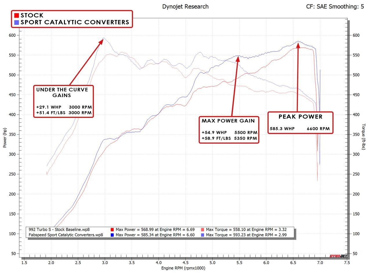 The Fabspeed HJS sport cats deliver a notable yet restrained increase in volume. In sport mode, expect more defined pops and gurgles on downshifts, while the overall exhaust note boasts a sharper, more distinct Porsche flat 6 sound. Additionally, turbo spooling becomes more noticeable compared to the factory system.