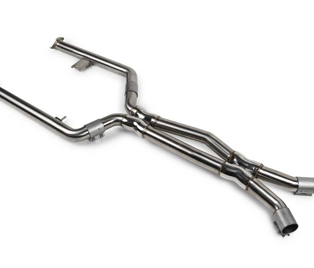 The Fabspeed Intermediate X-Pipe for the BMW M2 replaces the factory double “H” pipe with a dual cast x-pipe design, enhancing tone, volume, and power without introducing drone. It delivers a refined increase in sound, with louder downshift pops in sport mode and a smooth burble at idle for a more engaging yet comfortable driving experience.
