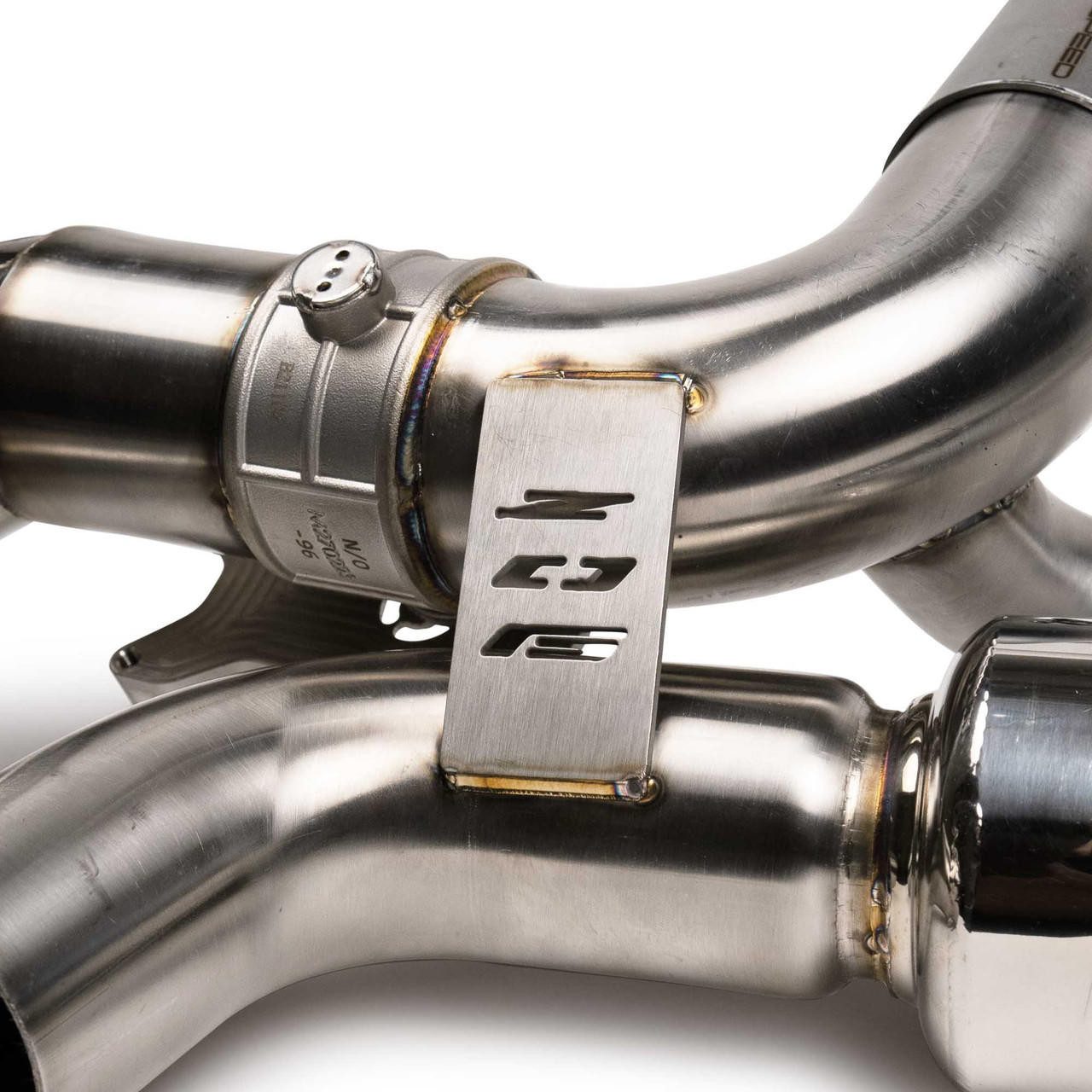 The design process began with 3D scanning the entire OEM exhaust system using a creaform 700 Handscan, enabling the creation of a complete Solidworks 3D model of the exhaust. Utilizing that model, the exhaust and fixtures were designed to ensure a perfect fit to OEM standards. After multiple revisions for sound quality and dyno testing, the decision was made to incorporate their signature cast x-pipe to connect the two cylinder banks for exhaust scavenging and to overcome resonance. The valves are attached to CNC’d plates designed to resist heat and maintain the functionality of the electronics under extreme conditions. The piping is mandrel-bent from T304 stainless steel, and ultra-high temperature heat wrapping is used to minimize engine bay temperatures.