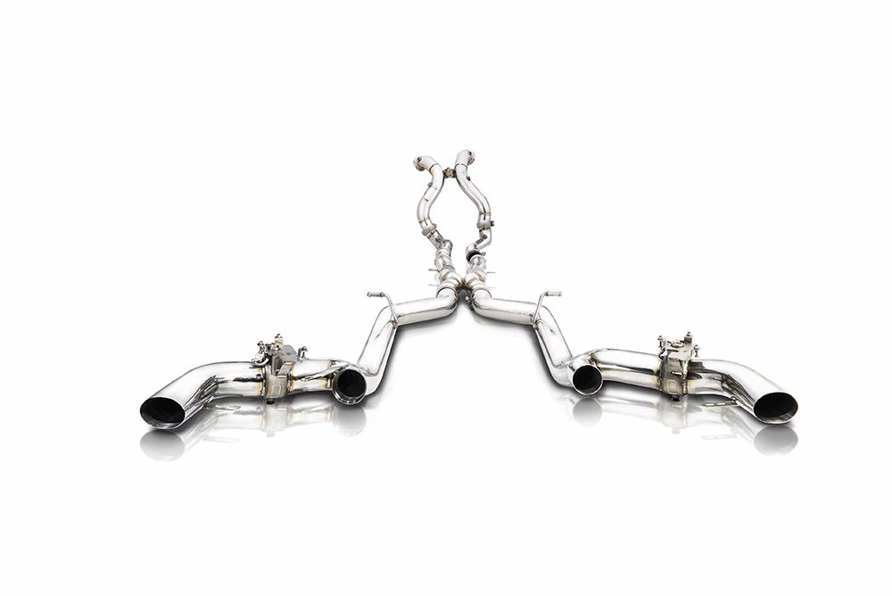 The Mercedes-AMG C190 / R190 GT R Fi Exhaust is a high-performance valvetronic exhaust system available in two configurations: a Signature Titanium and a T304 stainless steel variant, both designed as direct bolt-on replacements. The Signature Titanium version is crafted from ultra-lightweight titanium, reducing weight by approximately 46% compared to stainless steel while maintaining exceptional strength-to-weight characteristics. Every component, including valves, clamps, and screws, is made from titanium to maximize weight savings. Its 1.6mm thick pipe walls—0.6mm thicker than typical aftermarket options—enhance sound frequency, durability, and safety without significantly affecting performance. Polishing inside and out eliminates imperfections and optimizes gas flow and sound quality. The T304 stainless steel version delivers an exhilarating soundtrack and integrates valvetronic technology, allowing precise control of airflow and sound volume while improving overall performance and torque. With the full system—including the valvetronic catback and ultra-high flow downpipe—horsepower gains of 5–10% are typical. Closed valves route exhaust gases through the muffler for a refined drive, while open valves unleash a bold, aggressive exhaust note.