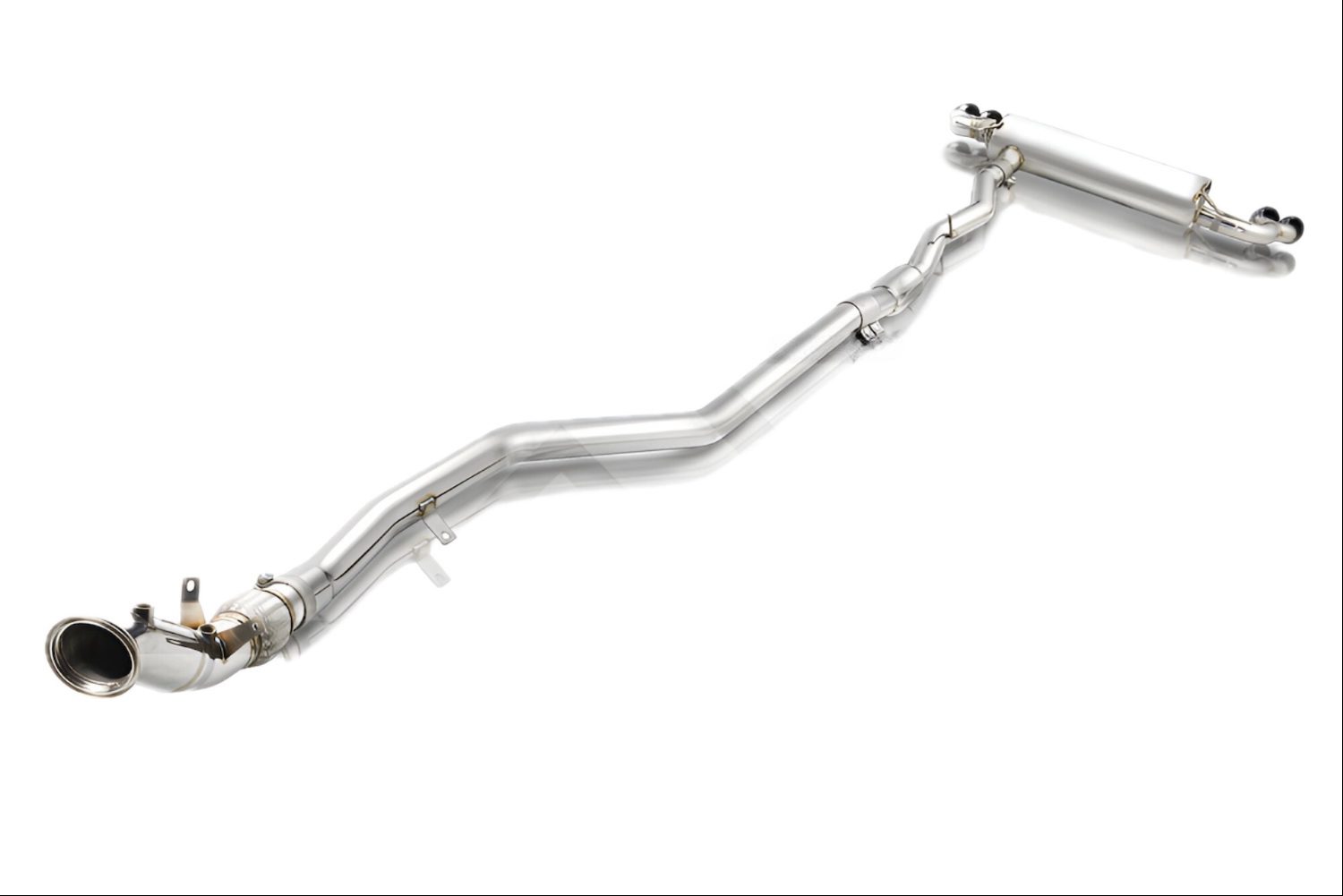 Fi EXHAUST offers a high-performance valvetronic exhaust system for the BMW G30 / G31 530i, designed as a direct bolt-on replacement. Constructed from high-grade T304 stainless steel, this system enhances both sound and performance, delivering an exhilarating exhaust note. Engineered with advanced valvetronic technology, the Fi EXHAUST system optimizes airflow, regulates sound volume, and improves torque. A full setup, including a valvetronic catback and ultra-high flow downpipe, can increase horsepower by approximately 5-10%. With the valves closed, exhaust gases are directed through the muffler for a refined and comfortable driving experience. When fully open, the system produces an intense and sporty exhaust note, amplifying the driving sensation. The distinct sound and enhanced performance of the BMW G30 / G31 530i are achieved through meticulously designed muffler internals, crafted to deliver the ultimate driving experience.