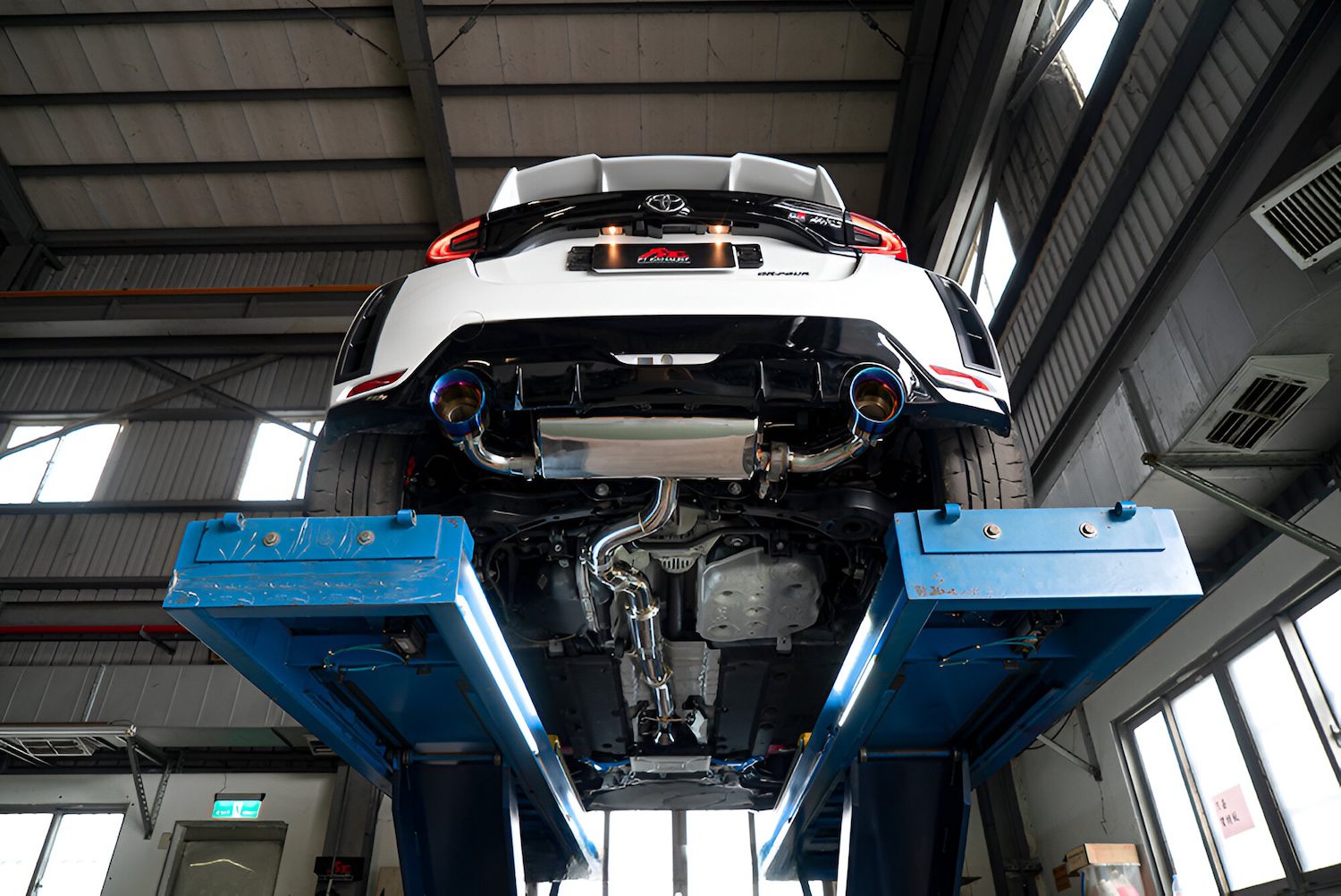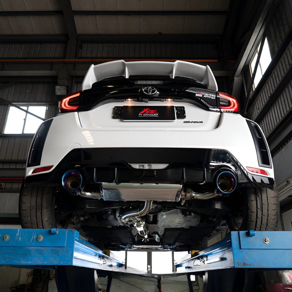 The Fi EXHAUST valvetronic system for the Toyota GR Yaris enhances performance, torque, and sound control. Made from high-grade T304 stainless steel, it increases horsepower by 5-10% with a full setup, offering a refined drive when closed and an intense exhaust note when open.
