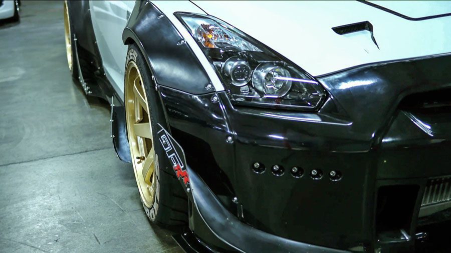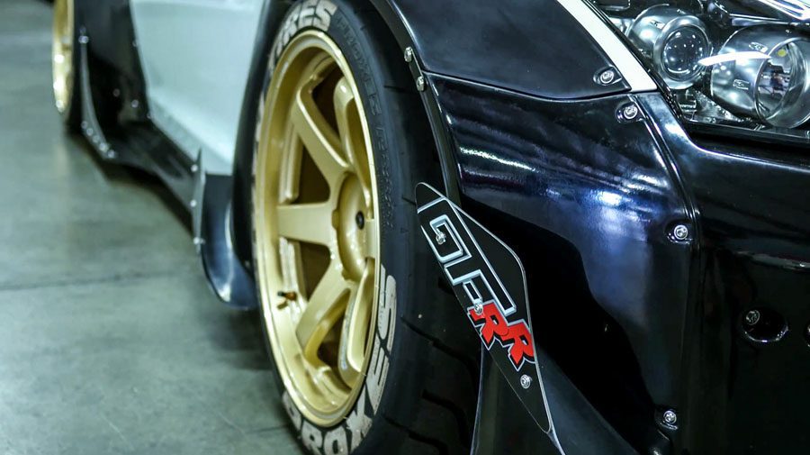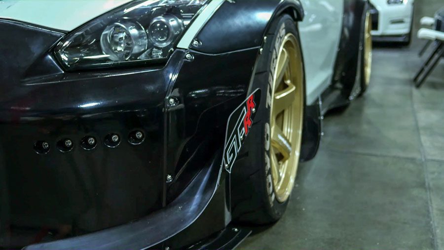 New from Rocketbunny! The GT-R body kit is designed by TRA Kyoto and features riveted fenders and a huge carbon wing. Kit is based on the Greddy D-Concept GT-R for the D1GP. Included in this wide body aero kit is: