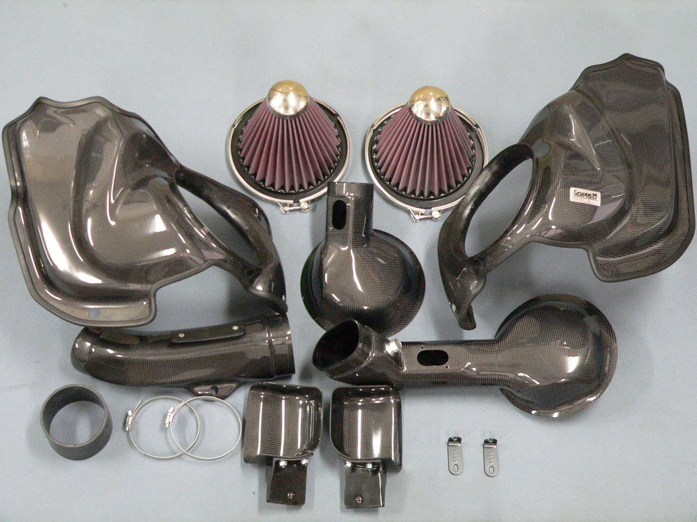 The large capacity filter case was designed to make use of engine room capacity to the maximum. All adapter pipes for air mass sensor which is important to engine output and ECU setting, and also all intake suction, were produced with carbon. We finished them to the product which are involved in performance and quality. Furthermore, the running wind from the front is directly inhaled in carbon air introduction guide which is attached to the grill back part.