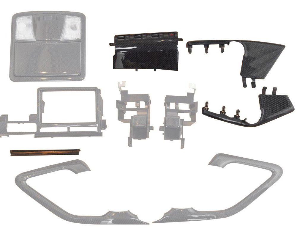 This listing is for a carbon fiber-converted OEM 4-piece Center Console Set for the R35 Nissan GT-R. This is not an overlay – these are genuine Nissan parts that have had components replaced with carbon fiber. This set includes: RRR Switch (1/4) Trim Bar (2/4) Left Side Piece (3/4) Right Side Piece (4/4))