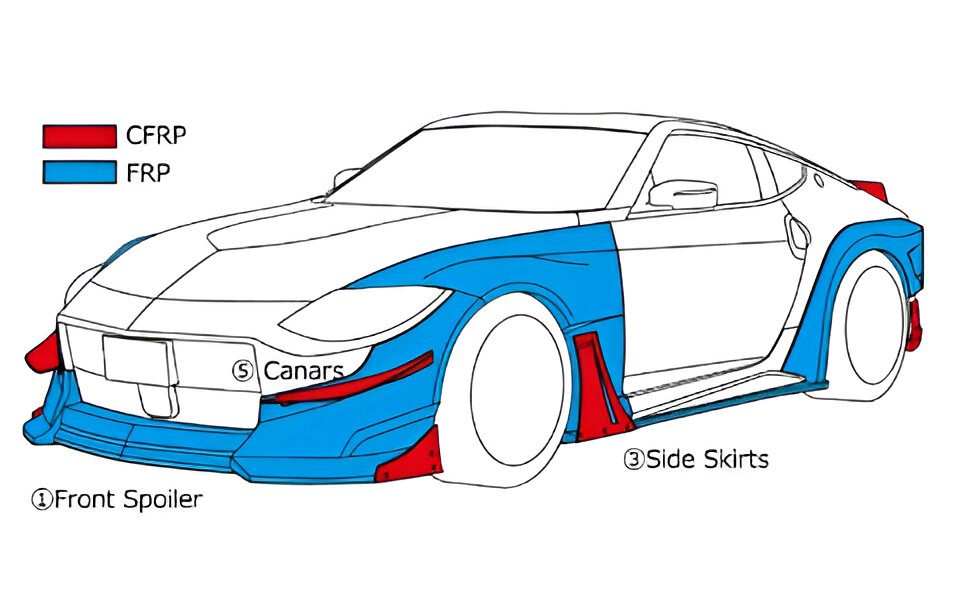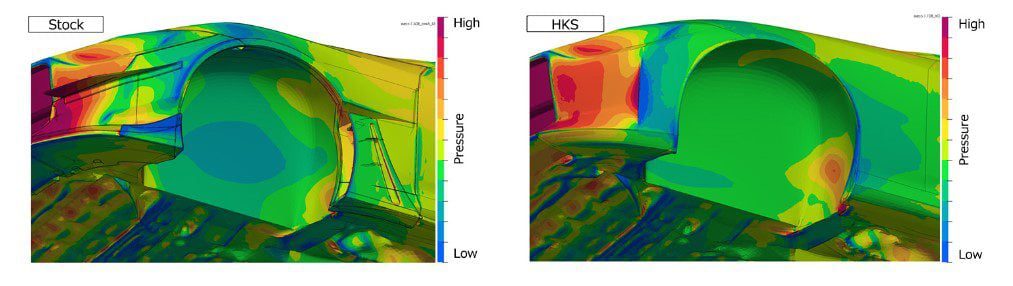 The design draws inspiration from the HKS racing style, infused with a GT aesthetic for street appeal. It exudes strength and sharpness, featuring Carbon Fiber in critical areas to enhance both performance and luxury. The canard and side barge panels play a crucial role in decreasing the overall pressure within the tire housing, thereby enhancing downforce