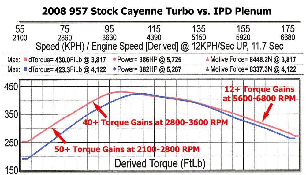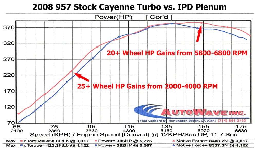 The IPD 76mm Plenum for the 955 Porsche Cayenne Turbo is a powerful upgrade that boosts performance with a more linear power delivery. Designed to work exceptionally well with Porsche Turbo models, this Plenum features an optimized diversion area and larger inlet openings, increasing intake air speed and enhancing turbulence for improved efficiency. The result is an impressive power gain of over 30 wheel horsepower and 32 foot-pounds of torque, delivering noticeable performance boosts across the entire power curve with quicker boost response. Constructed to withstand high boost levels, the durable IPD Plenum outperforms factory plastic intakes prone to cracking, providing reliable, bolt-on power that’s easy to install.