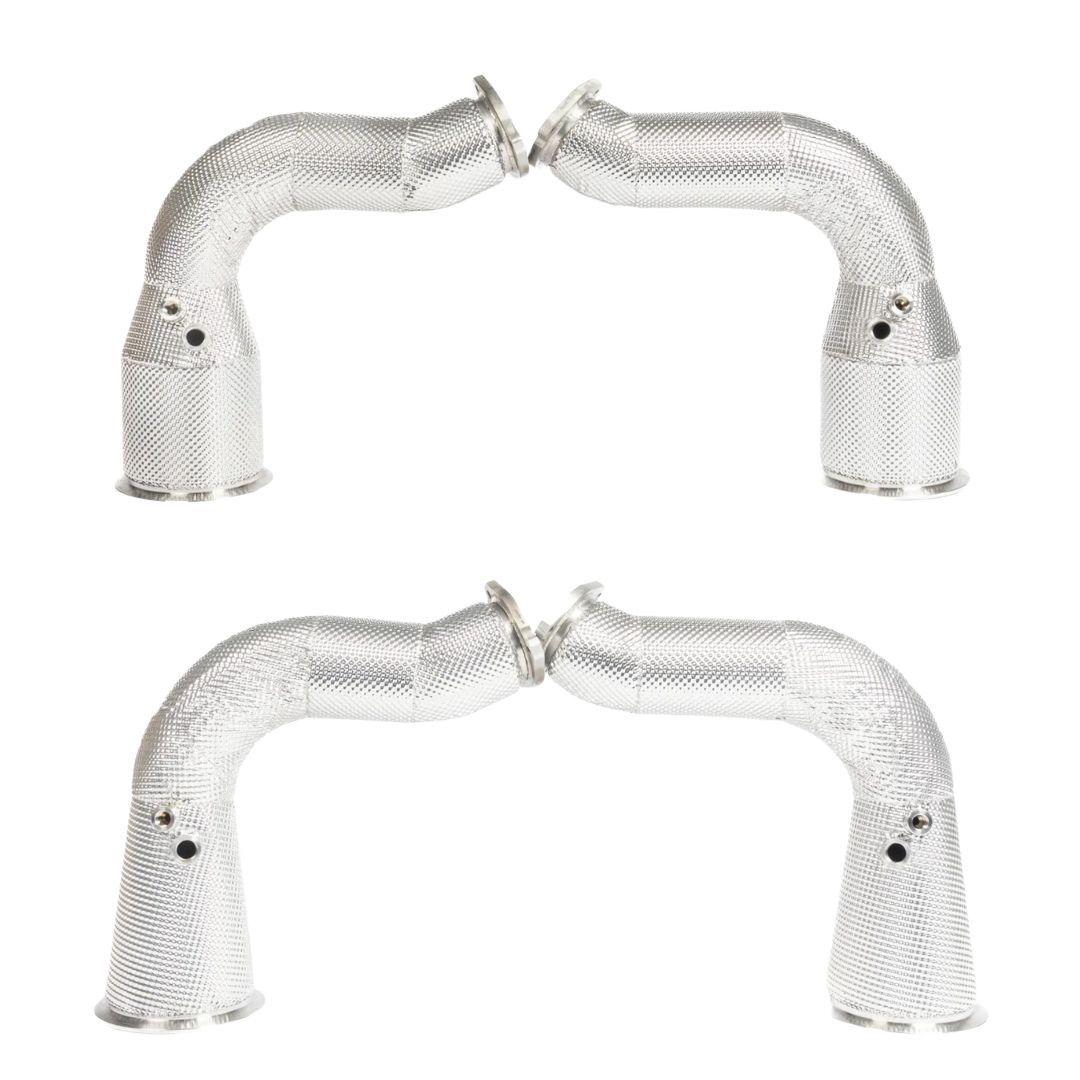 The JCR Inconel Silencers for the 9YA / 9YB Porsche Cayenne GTS and Turbo are a direct replacement for the OEM downpipes, designed to save weight, improve sound, and deliver significant performance gains. Crafted from 100% Inconel 625, this system is available as either a Race Silenced version with a high-flow HJS 200-cell core or as a Silencer Delete version for maximum performance and sound. Both options come with high-quality Inconel heat shielding to manage temperatures and reduce radiant heat. The Silenced version saves over 7kg, while the Silencer Delete version saves over 9kg, with both guaranteed to increase horsepower and torque.