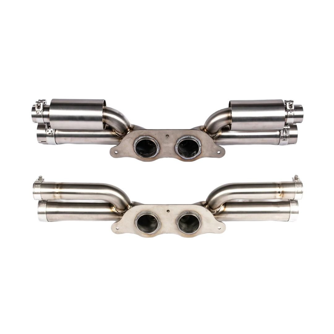 The JCR Titanium Center Bypass Section for the 997 and 991 Porsche 911 GT3, GT3 RS, GT3 RS 4.0, GT3 Touring, and R is a lightweight, high-performance upgrade that replaces the factory center silencer to improve both sound and driving feel. Offered in both Silenced and Non-Silenced versions, it gives drivers the choice between a more refined tone or a raw, race-inspired exhaust note, all while reducing weight to enhance handling balance. Built from premium titanium, it’s engineered for optimal exhaust flow, delivering sharper throttle response and noticeable performance gains. The direct bolt-on design makes installation straightforward, and it works seamlessly with factory or aftermarket tips for a tailored finish.