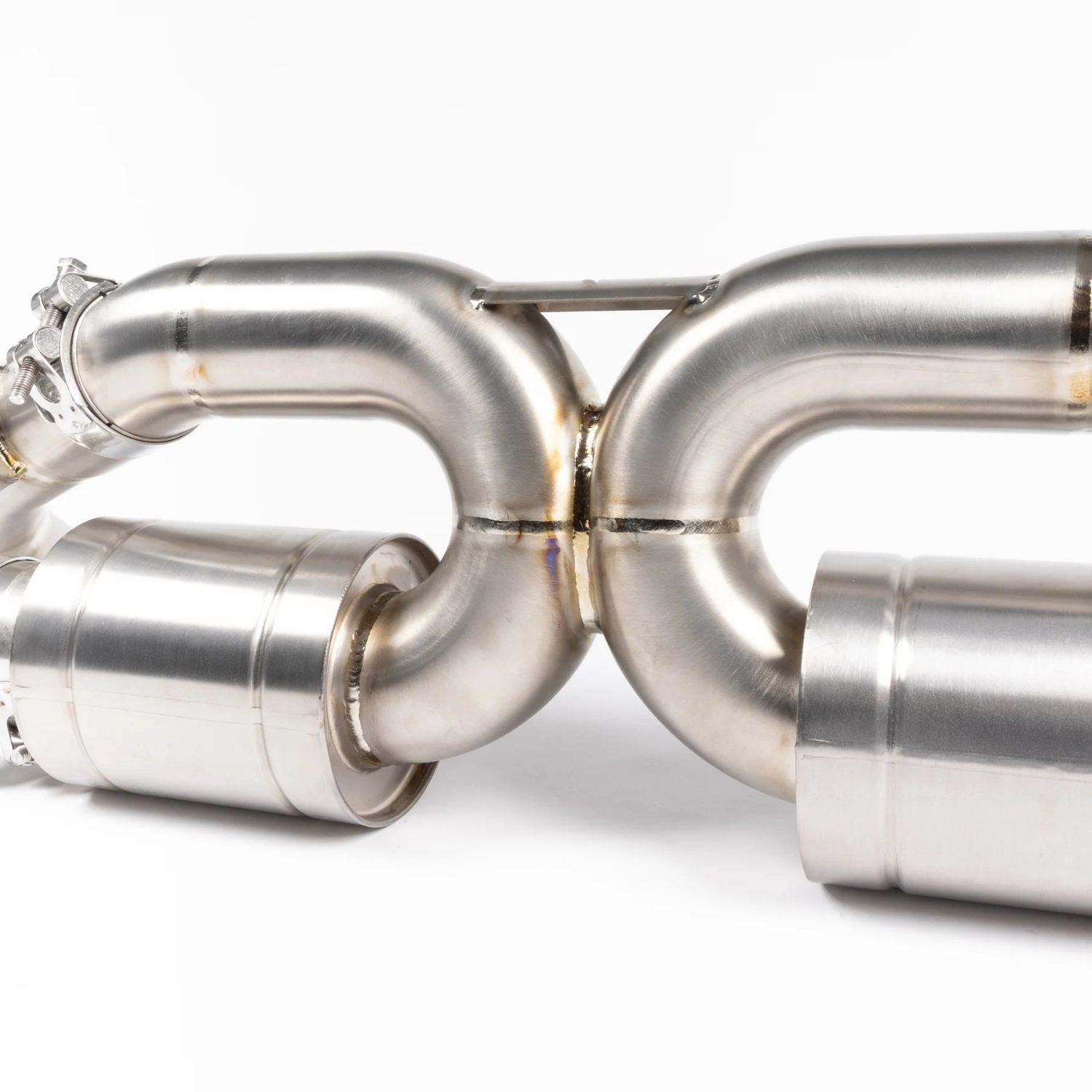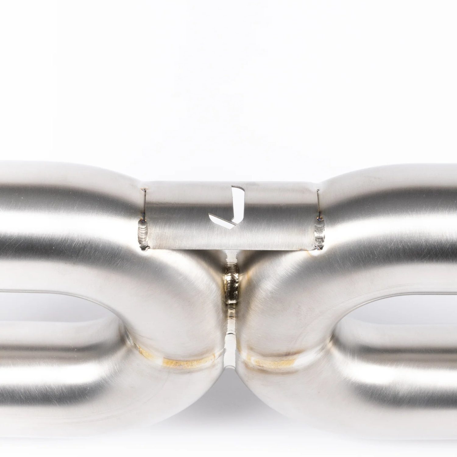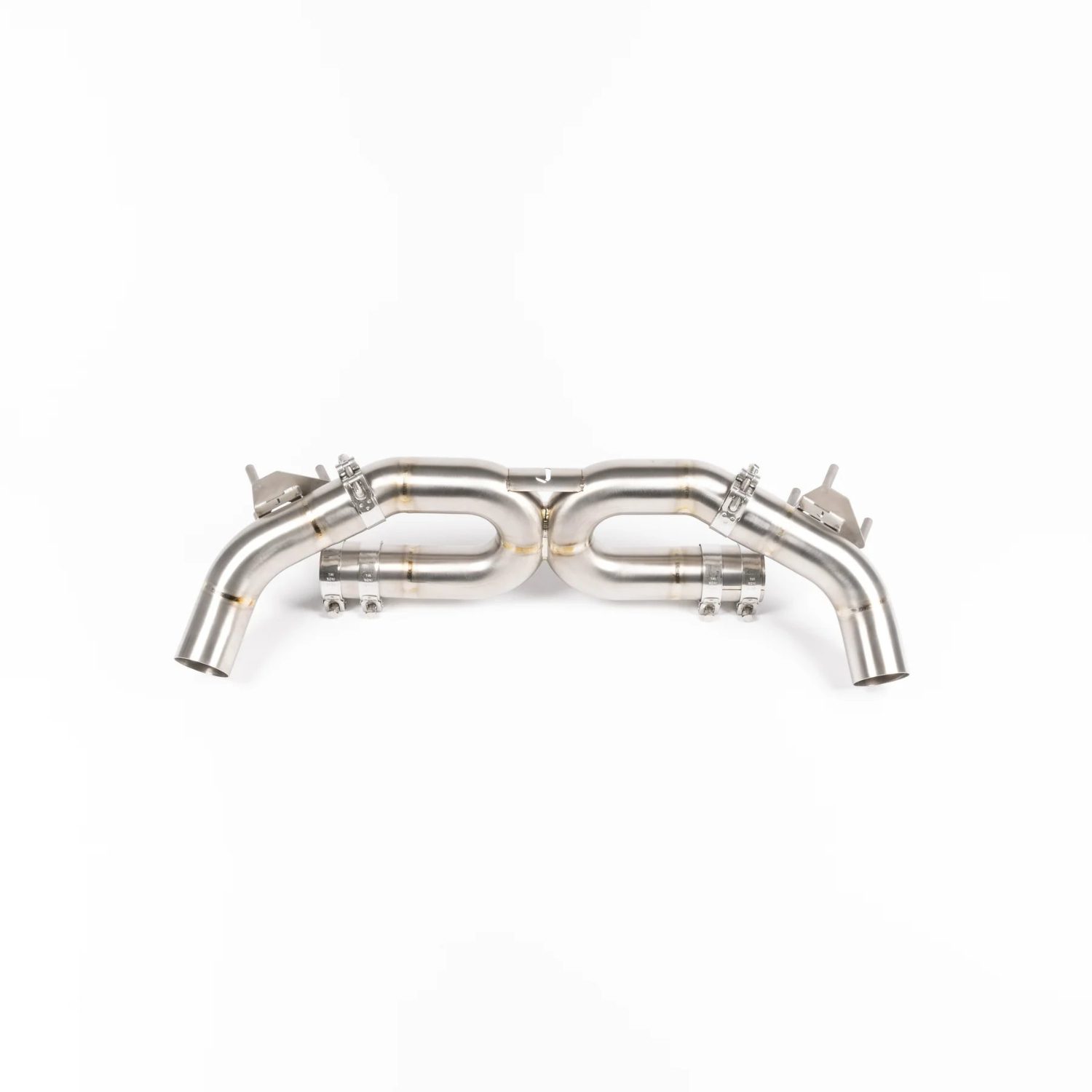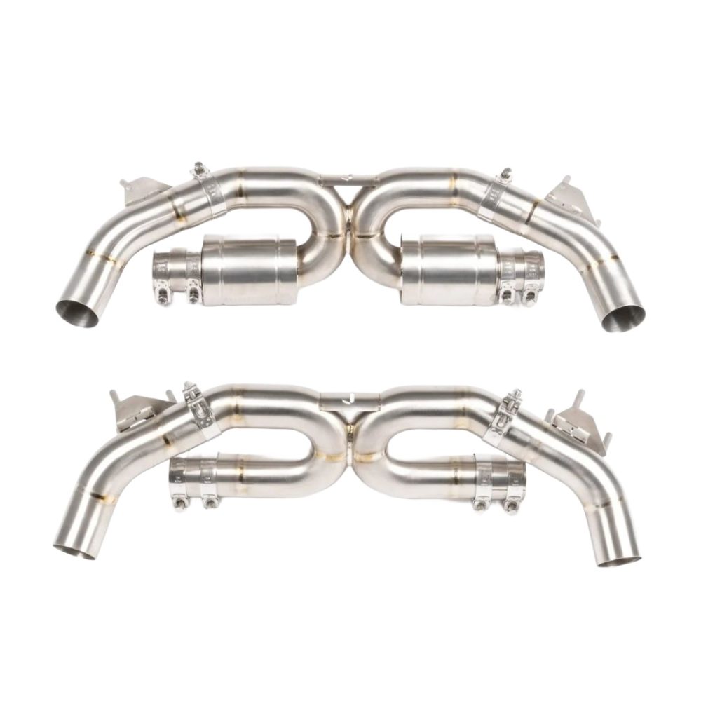 The JCR Titanium Center Section is a direct replacement for the OEM center section on the 992.1 Porsche 911 Carrera, Carrera S, Carrera GTS, Sport Classic, Turbo, and Turbo S. This non-valved system provides maximum flow and an aggressive sound. It is available in two versions — a Silenced version with high-flow silencers for a nice increase in sound, or a Non-Silenced version for the maximum possible weight savings and sound increase. Both versions delete the factory valve switching function for a more pure driving experience and include a built-in valve delete to ensure the car runs perfectly without any check engine lights. Crafted from lightweight titanium, this component is guaranteed to improve horsepower, torque, and sound while reducing weight. It is available for both Standard Models with Quad Tips and PSE-Equipped Models with Oval Tips.