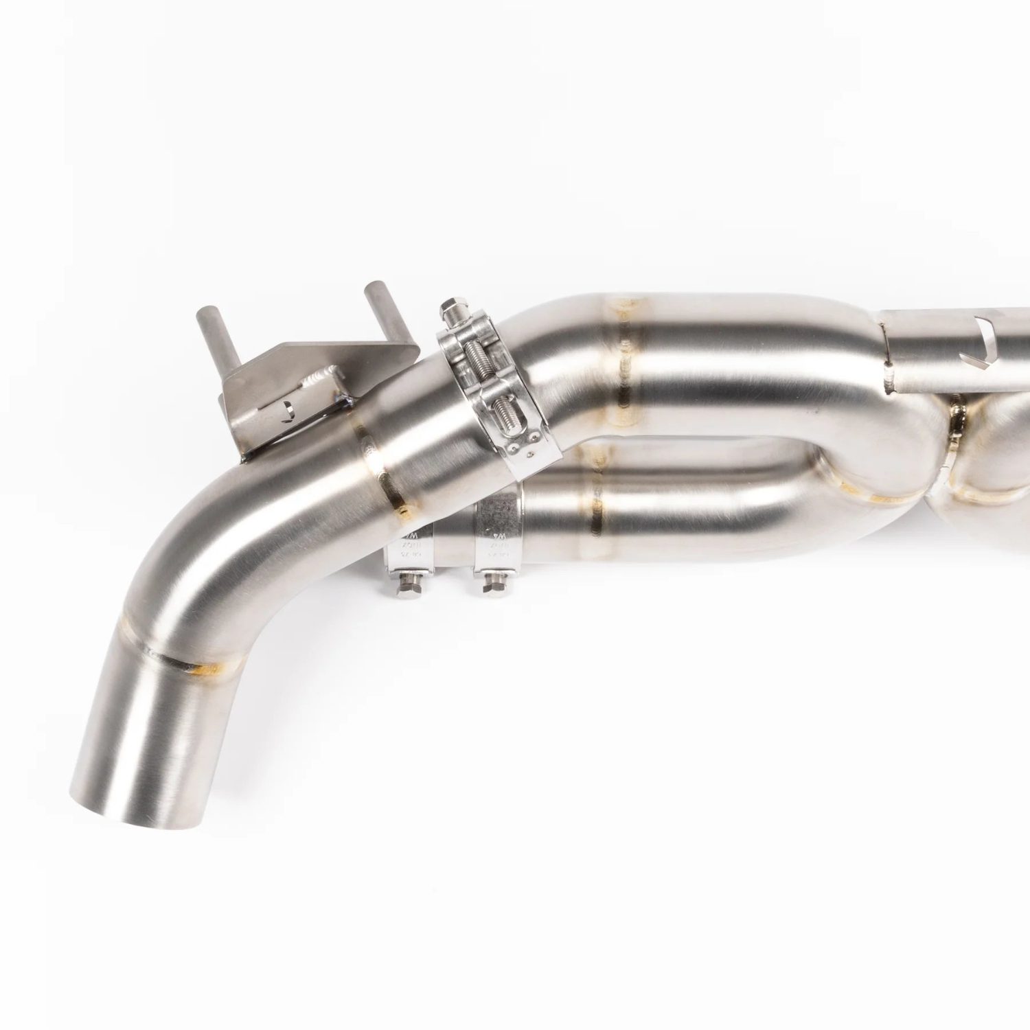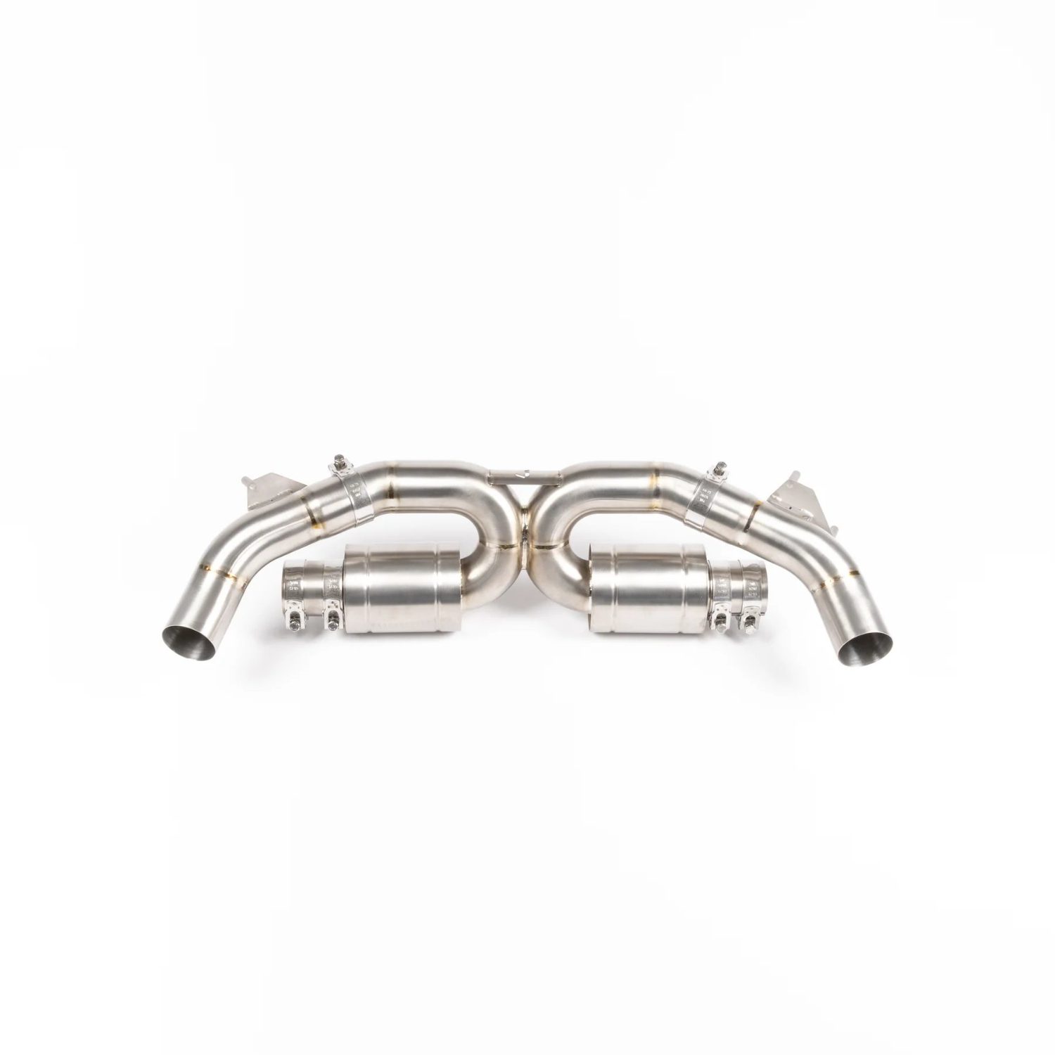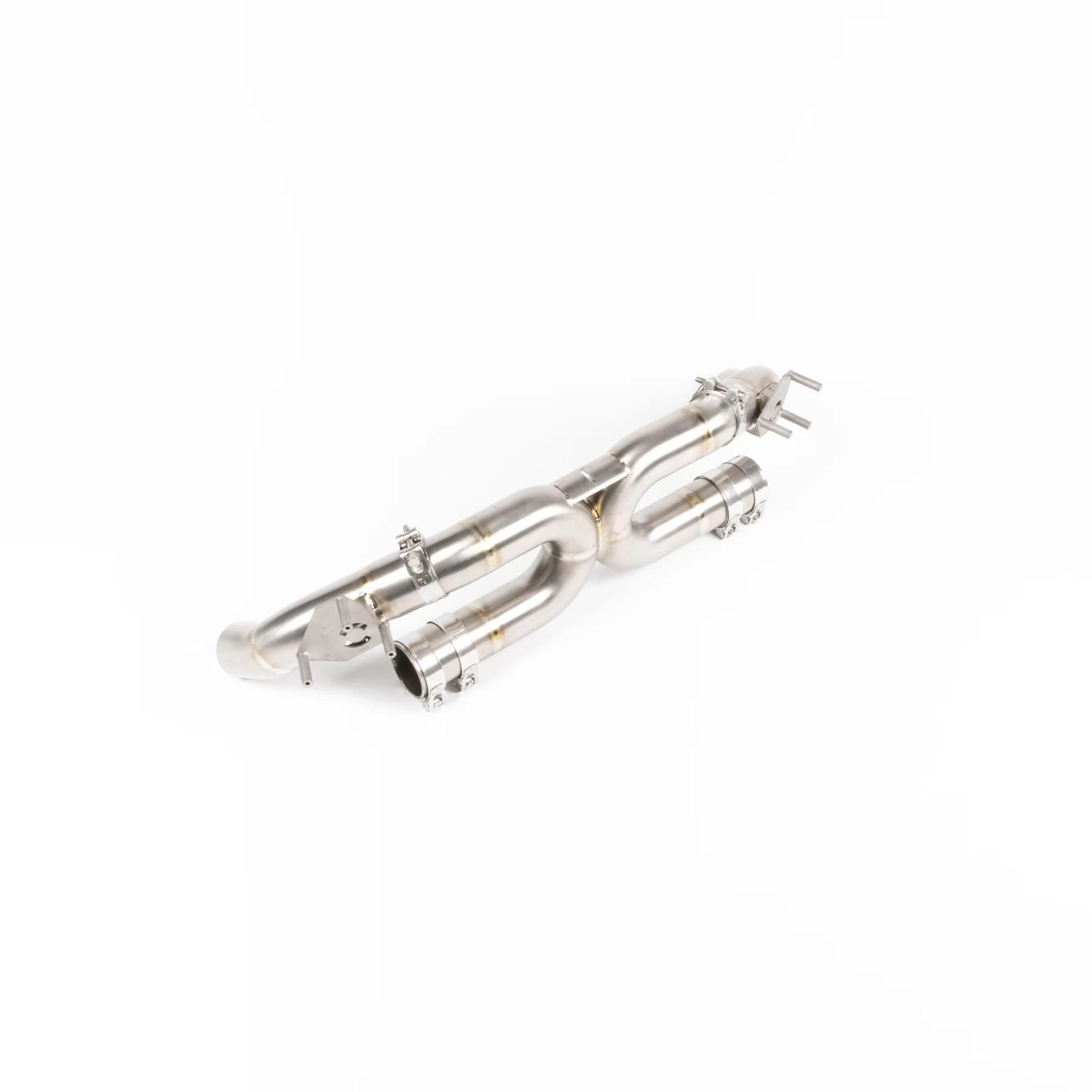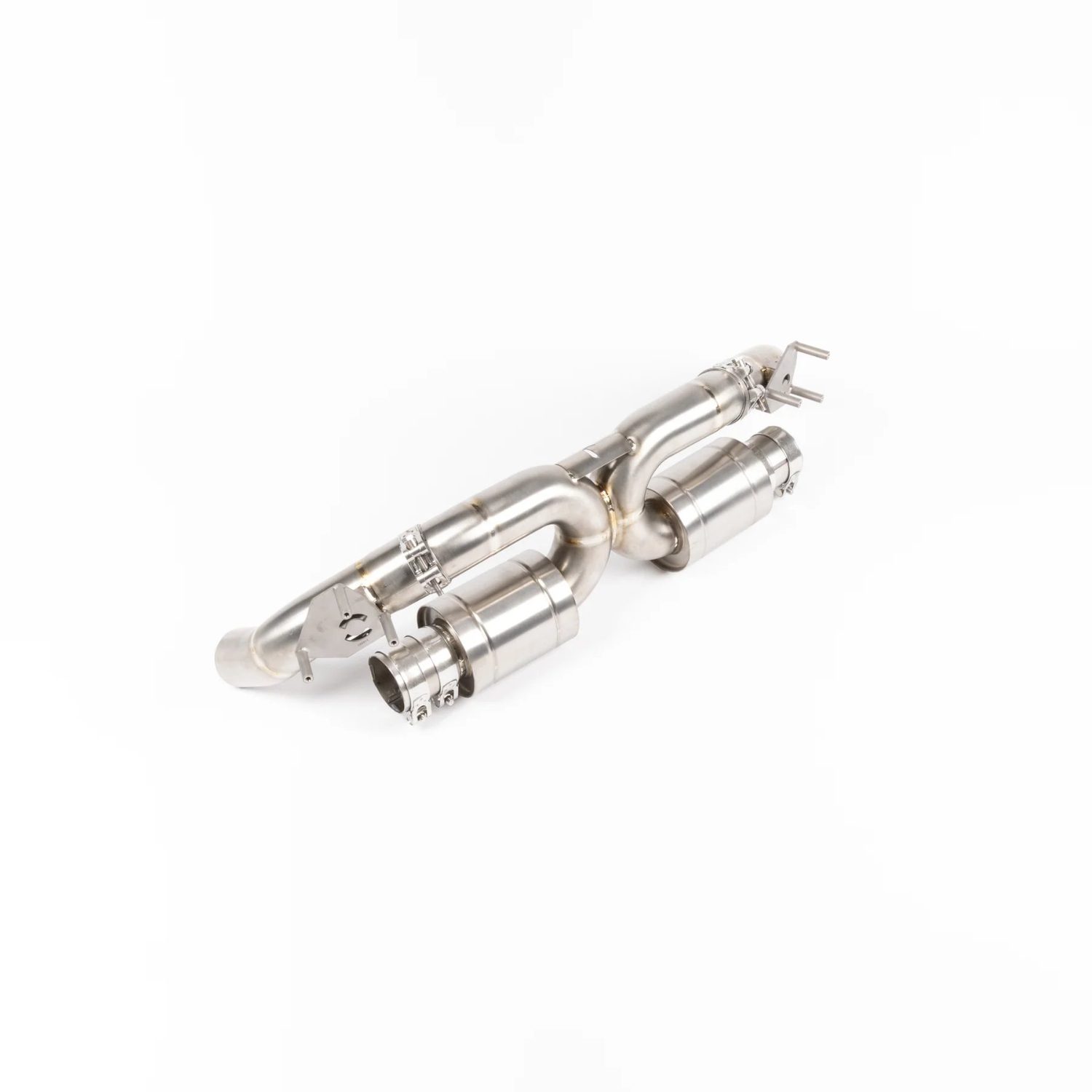 The JCR Titanium Center Section is a direct replacement for the OEM center section on the 992.1 Porsche 911 Carrera, Carrera S, Carrera GTS, Sport Classic, Turbo, and Turbo S. This non-valved system provides maximum flow and an aggressive sound. It is available in two versions — a Silenced version with high-flow silencers for a nice increase in sound, or a Non-Silenced version for the maximum possible weight savings and sound increase. Both versions delete the factory valve switching function for a more pure driving experience and include a built-in valve delete to ensure the car runs perfectly without any check engine lights. Crafted from lightweight titanium, this component is guaranteed to improve horsepower, torque, and sound while reducing weight. It is available for both Standard Models with Quad Tips and PSE-Equipped Models with Oval Tips.