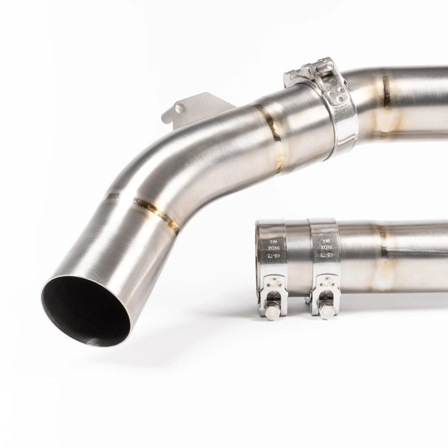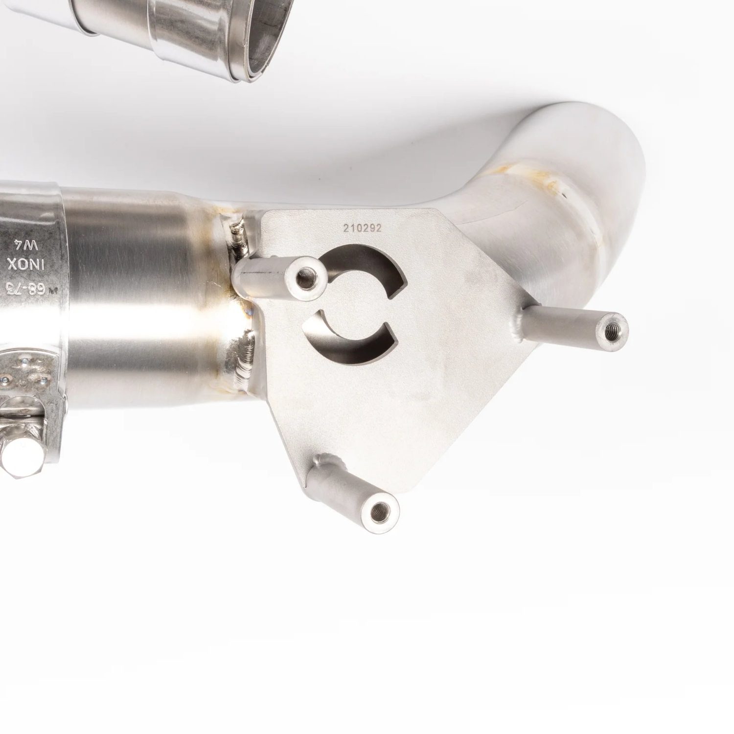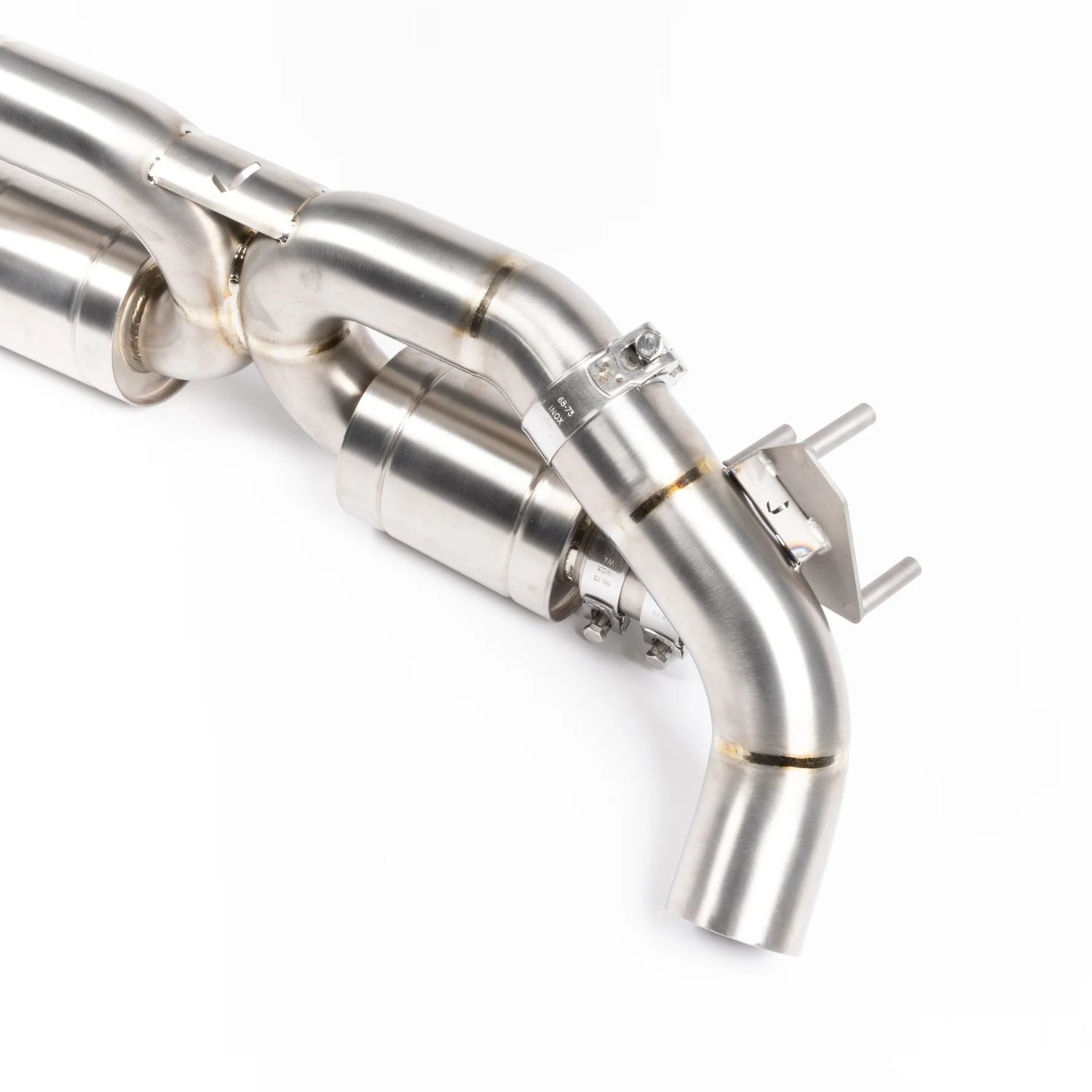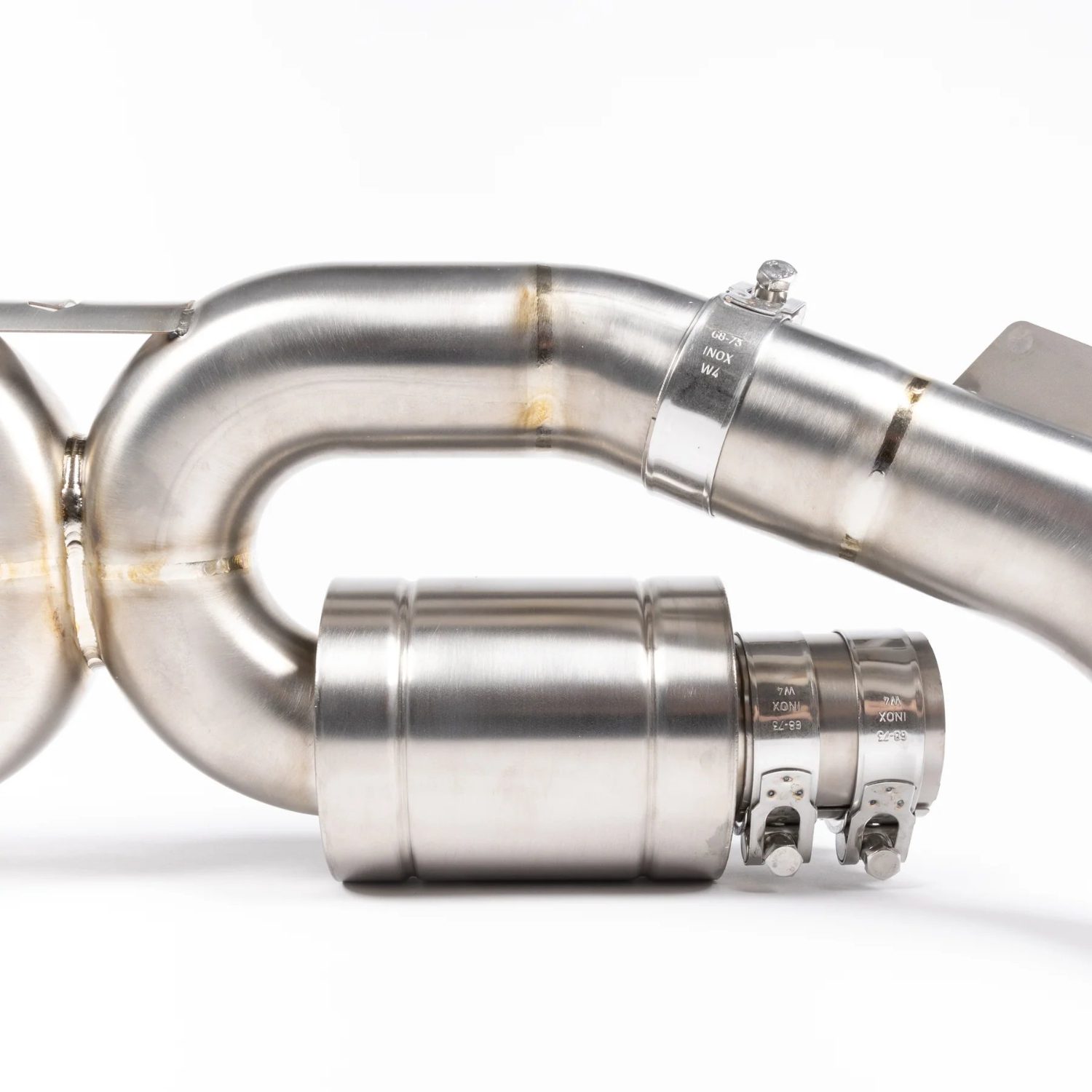 The JCR Titanium Center Section is a direct replacement for the OEM center section on the 992.1 Porsche 911 Carrera, Carrera S, Carrera GTS, Sport Classic, Turbo, and Turbo S. This non-valved system provides maximum flow and an aggressive sound. It is available in two versions — a Silenced version with high-flow silencers for a nice increase in sound, or a Non-Silenced version for the maximum possible weight savings and sound increase. Both versions delete the factory valve switching function for a more pure driving experience and include a built-in valve delete to ensure the car runs perfectly without any check engine lights. Crafted from lightweight titanium, this component is guaranteed to improve horsepower, torque, and sound while reducing weight. It is available for both Standard Models with Quad Tips and PSE-Equipped Models with Oval Tips.