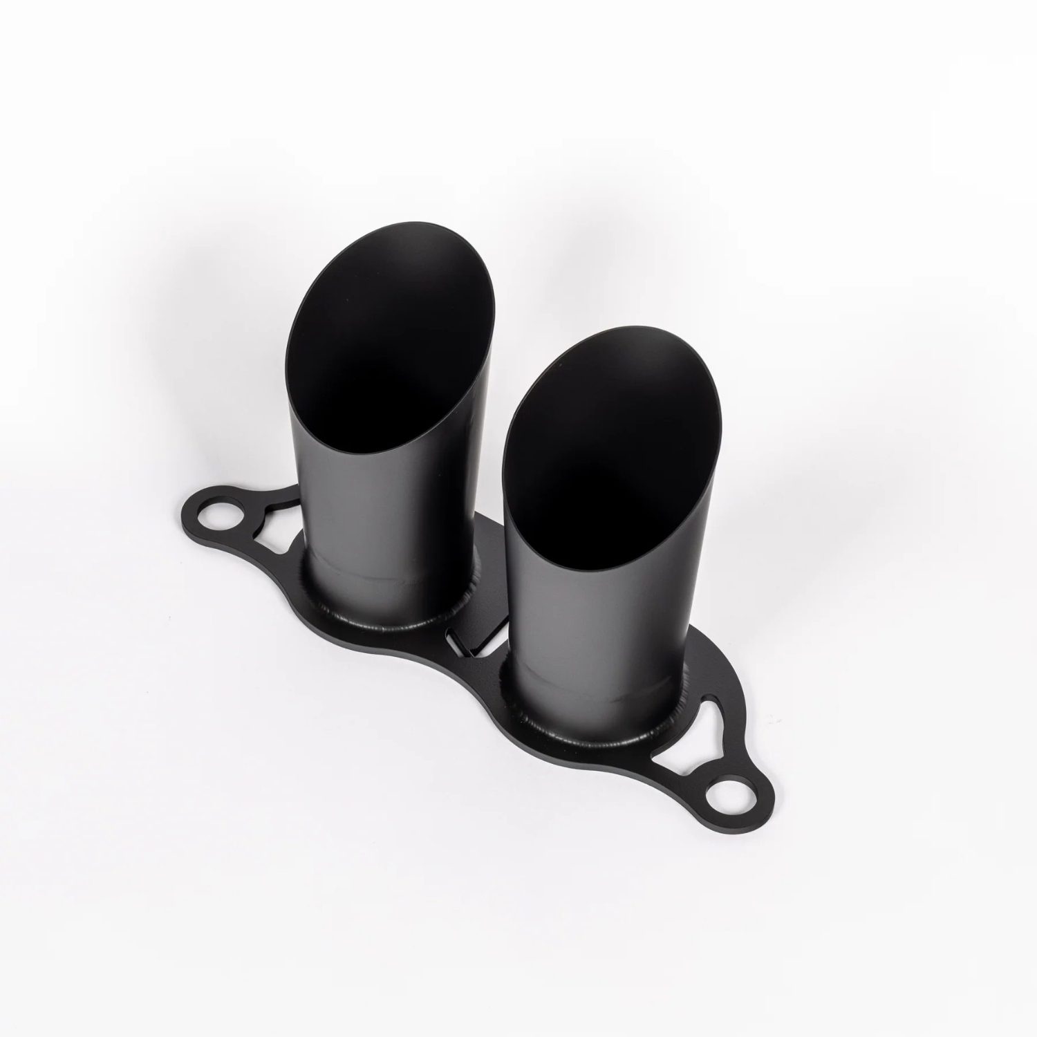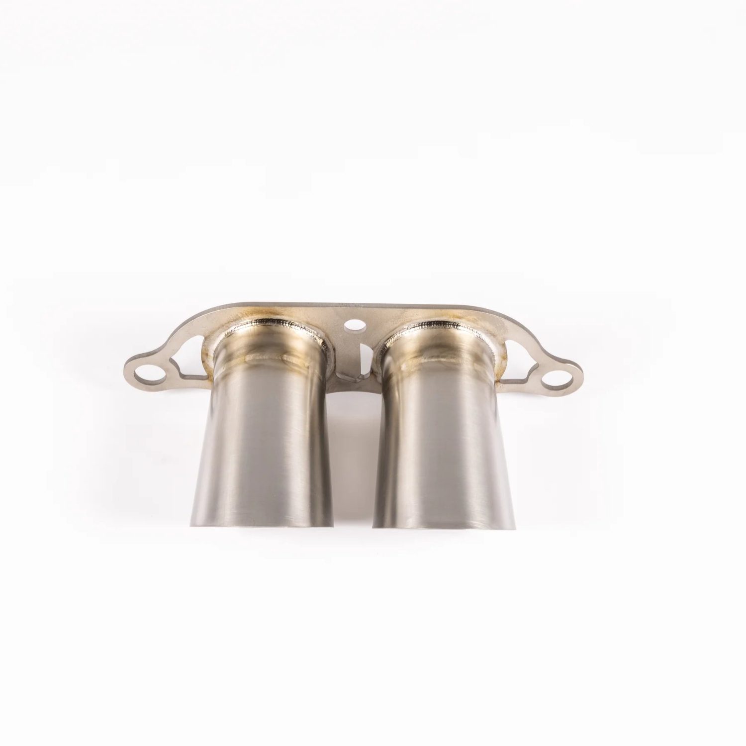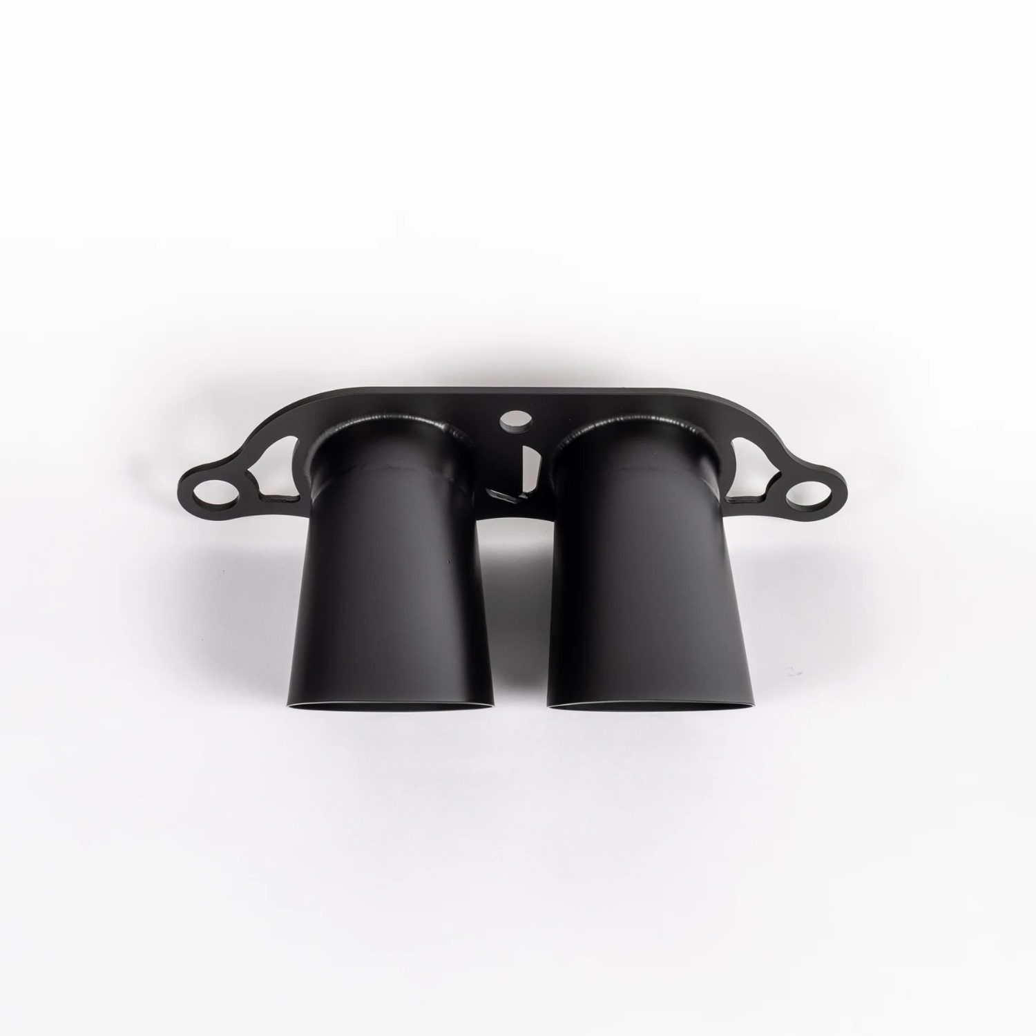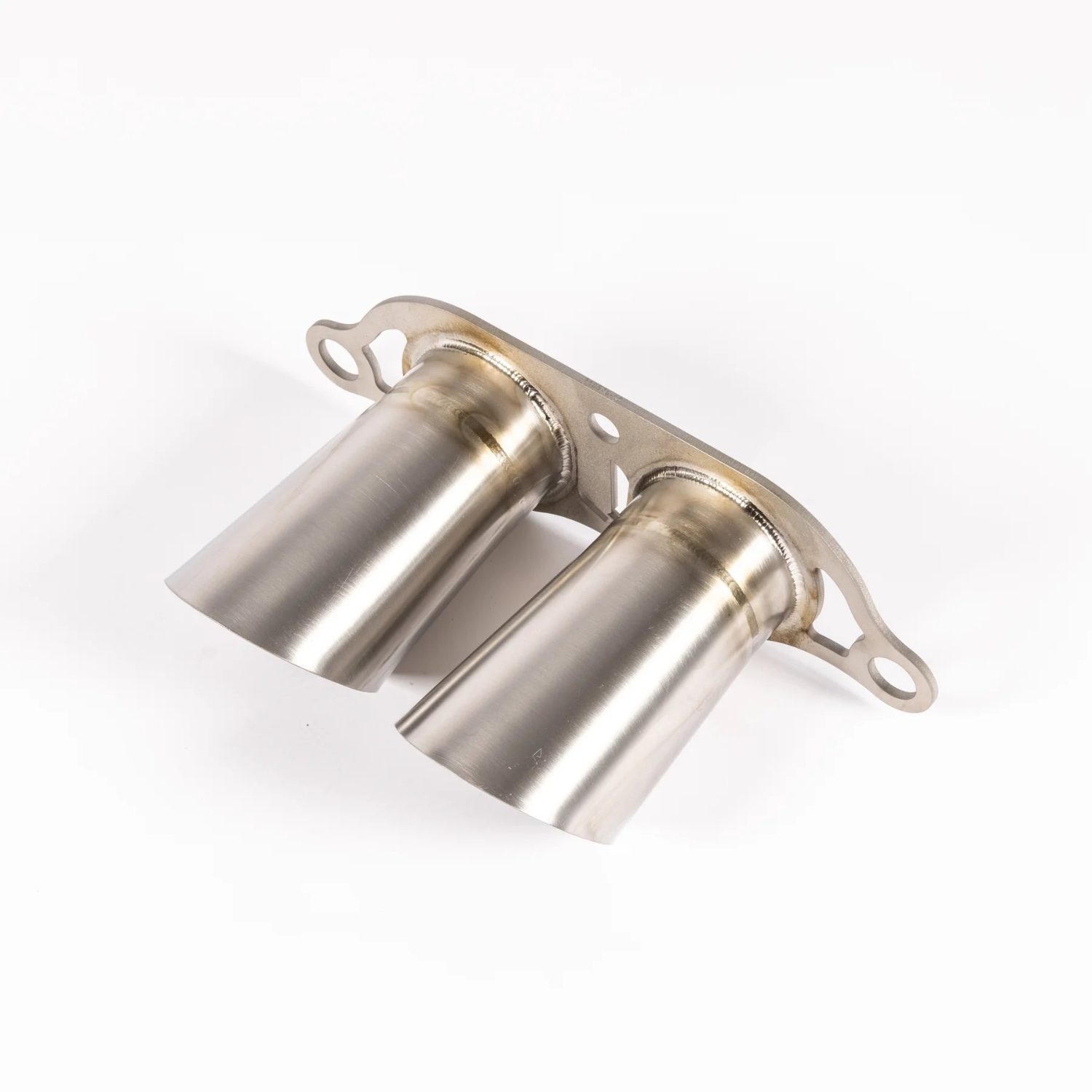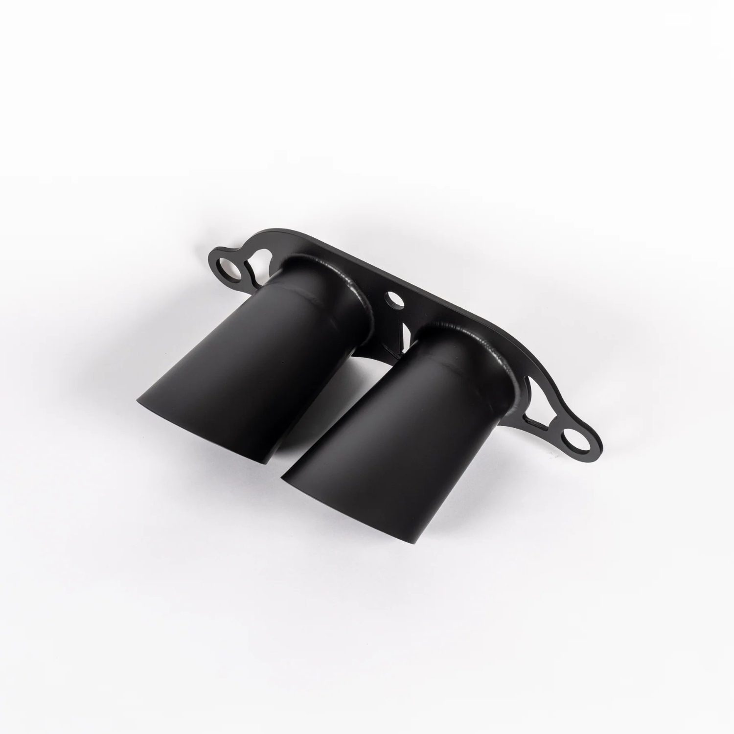 The JCR Titanium Race Megaphone Exhaust Tips are 100% titanium tips designed for JCR exhaust systems on the 992 Porsche 911 GT3 series and S/T. They are not compatible with OEM tips and are made to enhance the car’s sound and appearance with a larger, more aggressive design, available in a Raw or Black Coated finish.