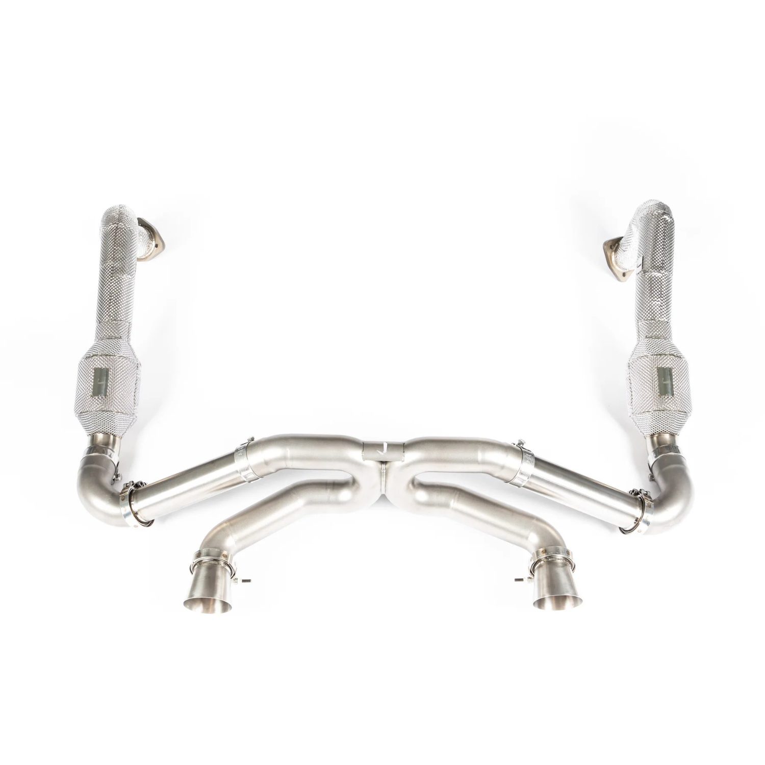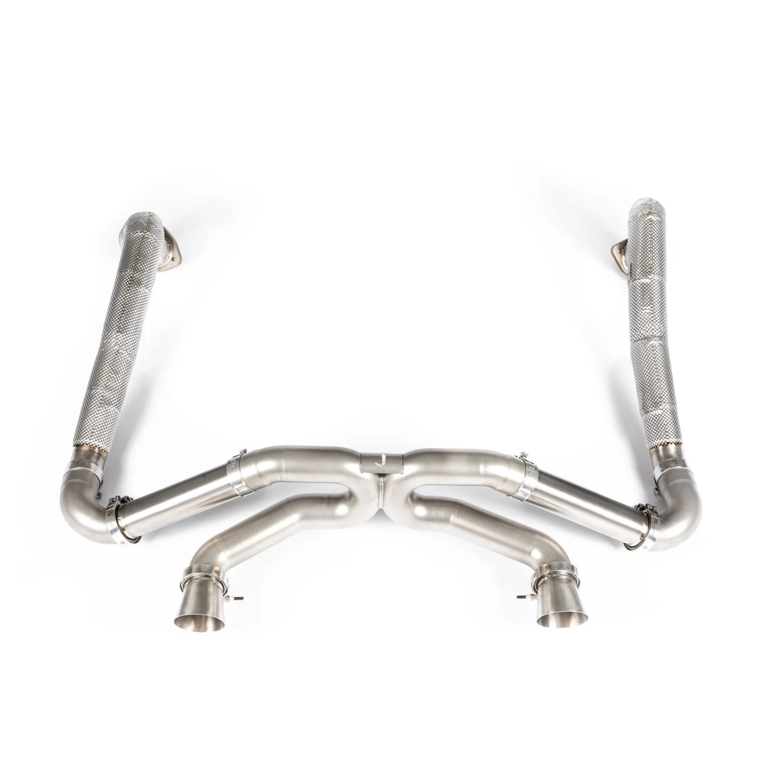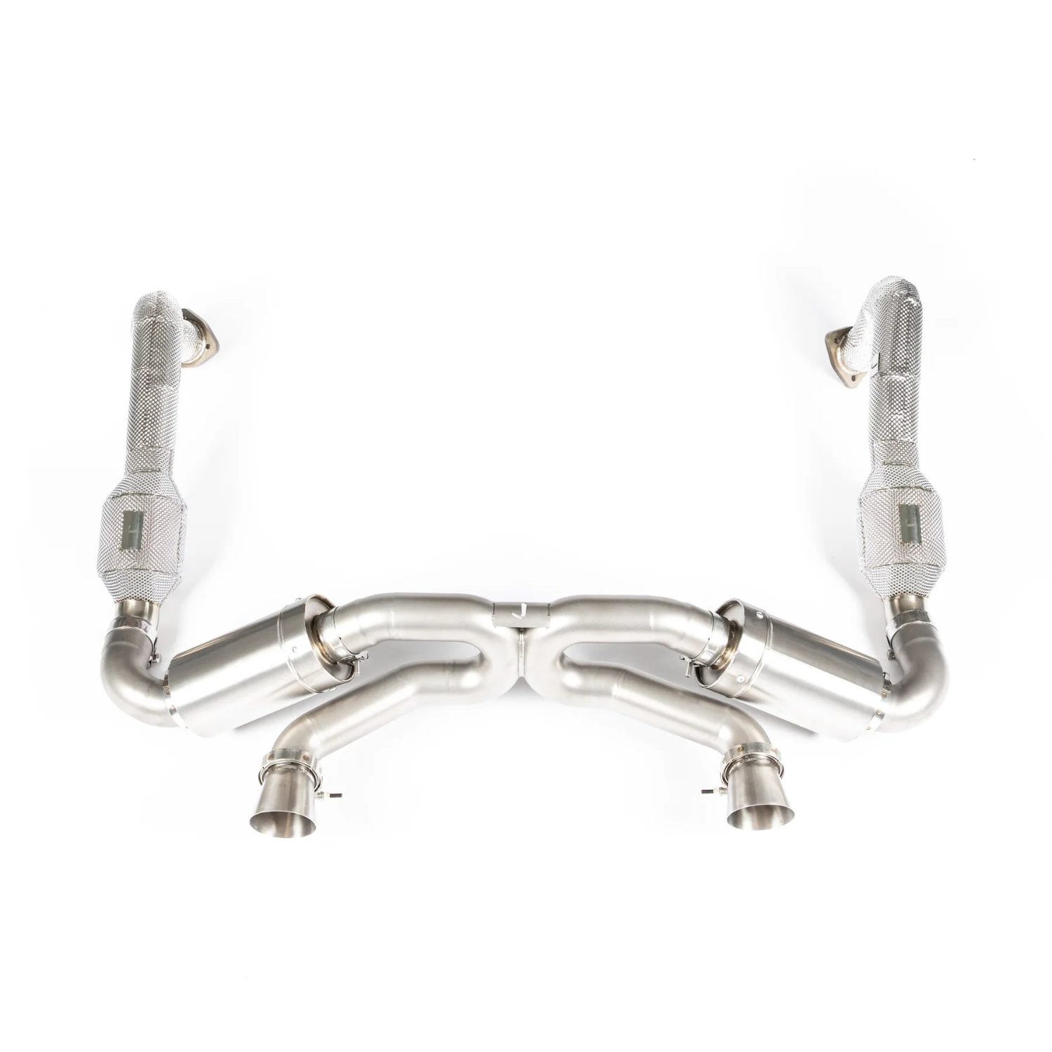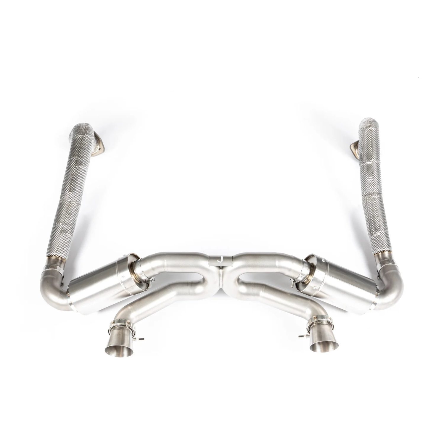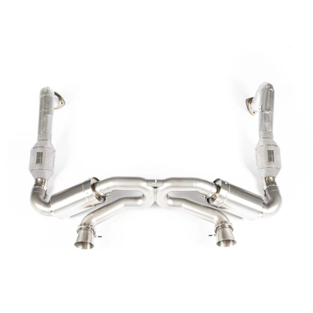 The JCR Titanium Superlight Race Exhaust System & Link Pipe Assembly for the 982 Porsche 718 Boxster GTS 4.0, Spyder, Cayman GT4, and GTS 4.0 offers an advanced performance upgrade with the option for either Silenced or Non-Silenced Superlight Exhaust Systems and Inconel Silenced Link Pipes or Titanium Non-Silenced Link Pipes. Designed to reduce weight while enhancing both power and sound, this assembly is crafted from high-quality titanium and Inconel for maximum strength, durability, and heat resistance. The Silenced version provides a refined exhaust tone while maintaining emissions compliance, perfect for street and track use, while the Non-Silenced version delivers a more aggressive race-inspired sound, improving exhaust flow and throttle response. This assembly is a direct replacement for the factory system, offering easy installation and significant improvements in vehicle performance and exhaust note.