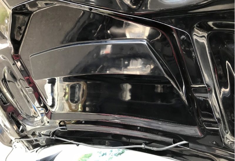 On a wet day, a rain shield constructed of FRP stops water droplets from entering the engine compartment.