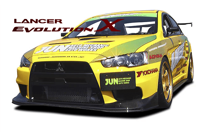 Original aero parts for the Mitsubishi Evo X by Jun Auto. These parts have the aggressive track-ready image all around the car. This Front Lip Spoiler is jutting to the front, and keeps low position. It utilizes a stock form of front bumper, and created sporty atmosphere.