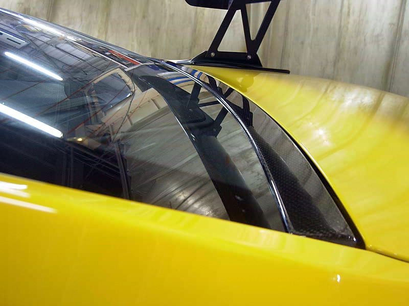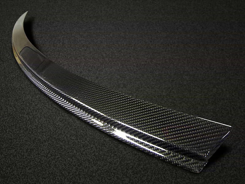 Rear glass garnish produced by Jun for the Nissan R35 GT-R. Because a joint between rear glass and trunk hood of the GT-R is bag-shaped, it does not flow air smoothly but become resistance. Moreover, the resistance spoils effective air flow to rear wing. The Rear Glass Garnish will control the effective air flowing.