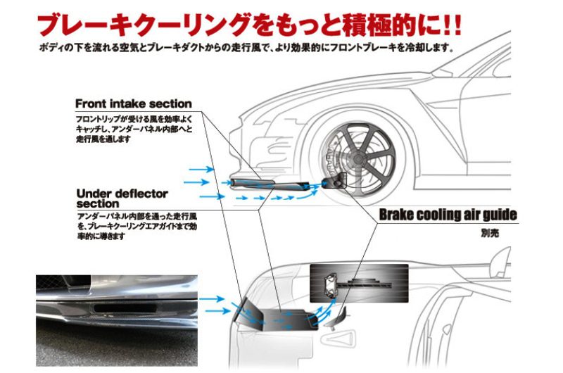 The running wind taken in by the air intake section passes through the inside of the genuine under panel and is efficiently guided to the brake cooling air guide by the under deflector together with the wind flowing under the body. Kansai Service designed specifically to cool your GT-R’s brakes whether you’re ripping it on the streets or the track.