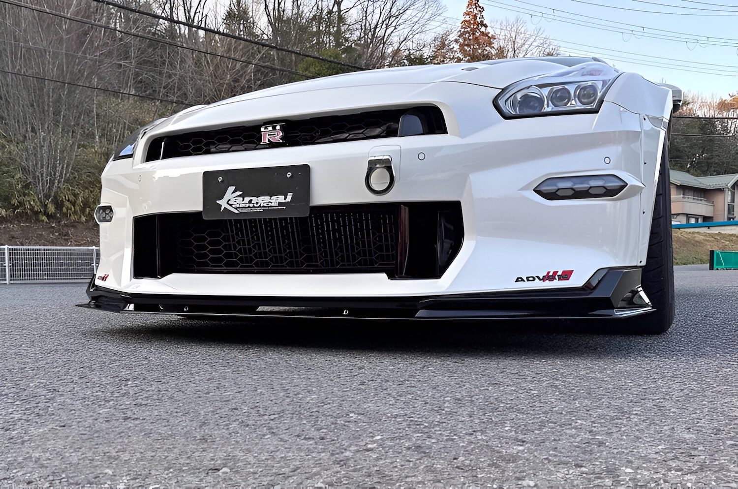 The Kansai Service Front Lip Spoiler for the R35 GT-R enhances front-end aesthetics and aerodynamic performance with a sleek 25mm profile, functional center duct, and availability in FRP or carbon fiber.