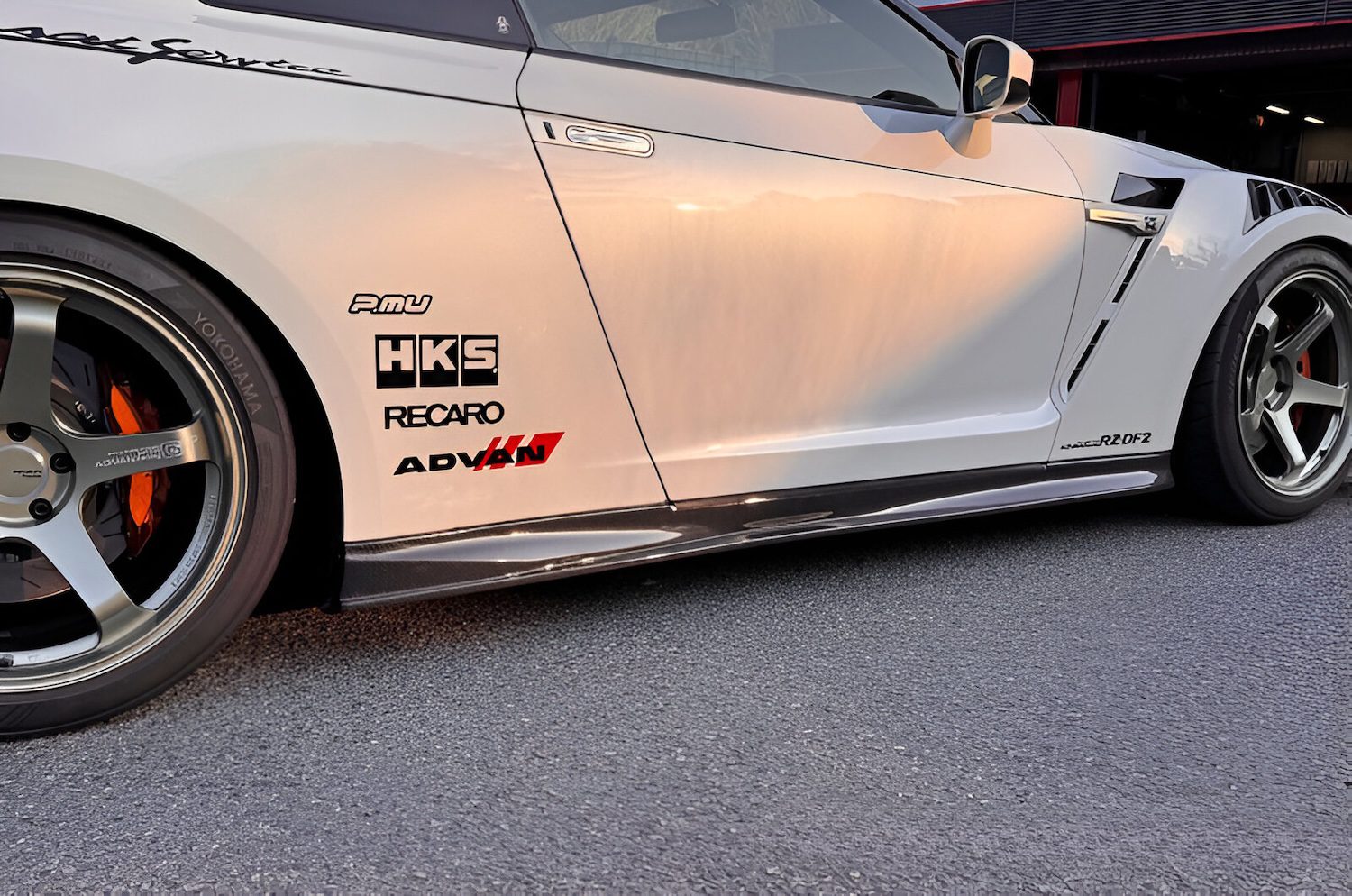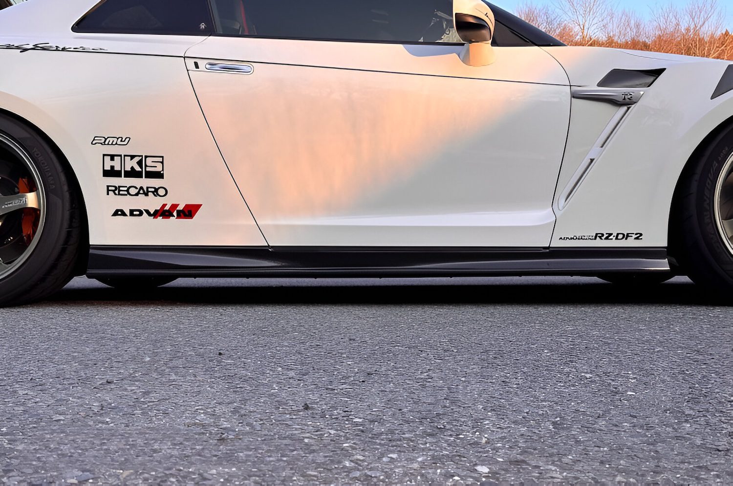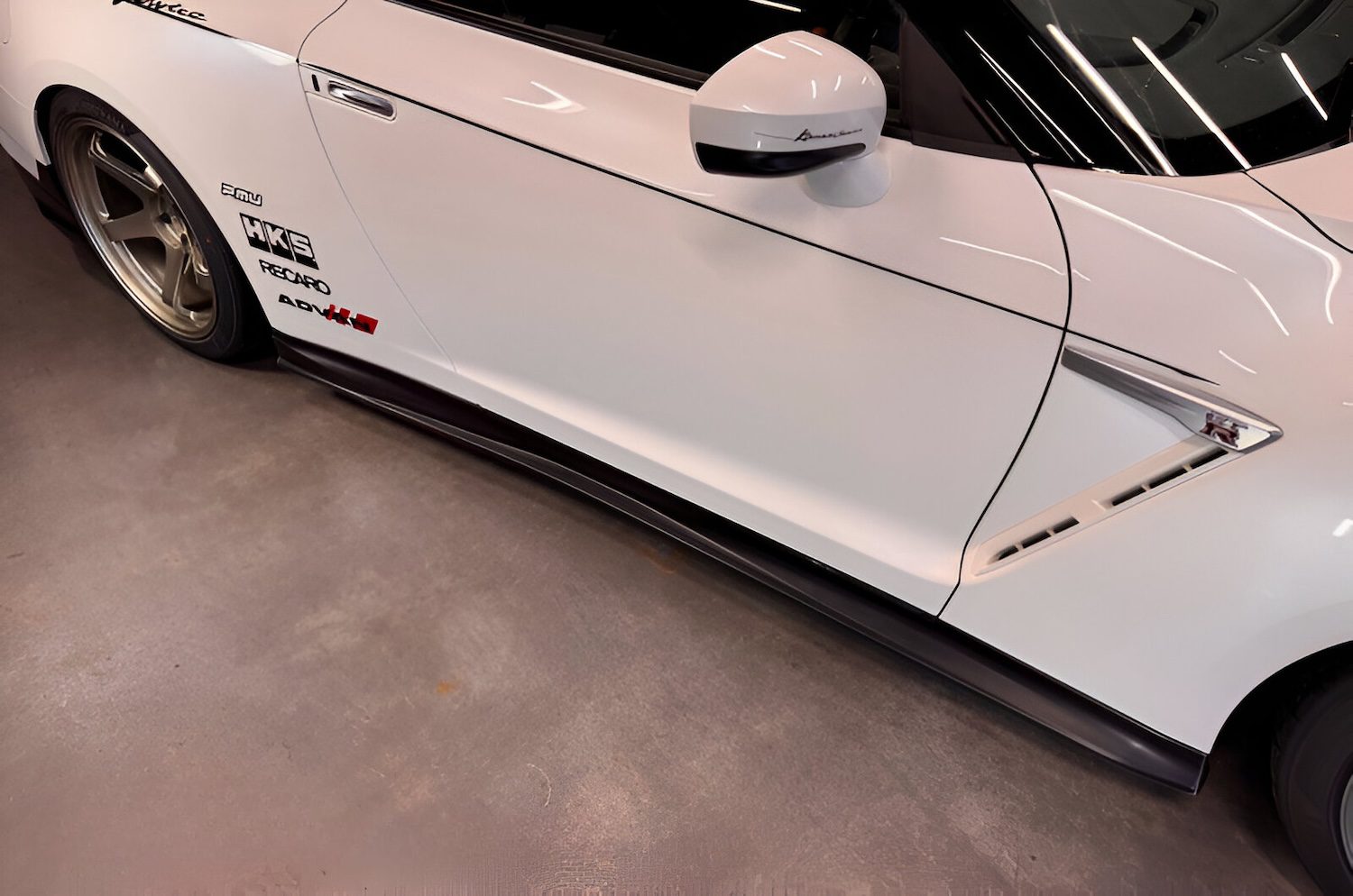 Kansai Service Side Steps for the R35 GT-R enhance the side profile with a tapered, sporty design that emphasizes the wheel housings while maintaining original ground clearance for easy maintenance.