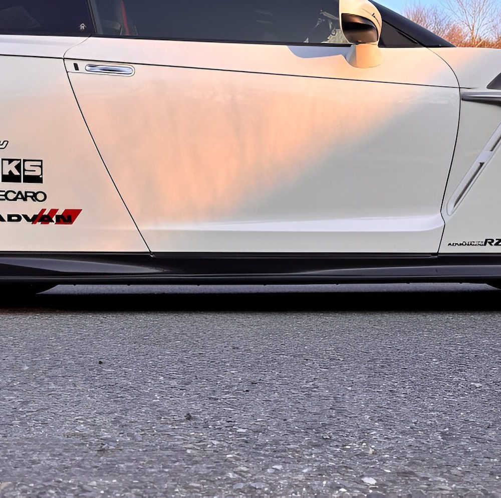 Kansai Service developed the Side Steps for the R35 GT-R to elevate the vehicle’s side profile with a refined, dynamic design that integrates seamlessly with the front lip spoiler. By narrowing toward the center, the steps accentuate the pronounced contours of the front and rear wheel housings, introducing a sense of movement and depth to the flat side surfaces. The underside remains flat for a clean, sporty finish in keeping with Kansai Service’s signature aesthetic. Designed with practicality in mind, the side steps maintain the GT-R’s original ground clearance, ensuring hassle-free maintenance while enhancing the overall visual impact with a high-quality, performance-oriented look.