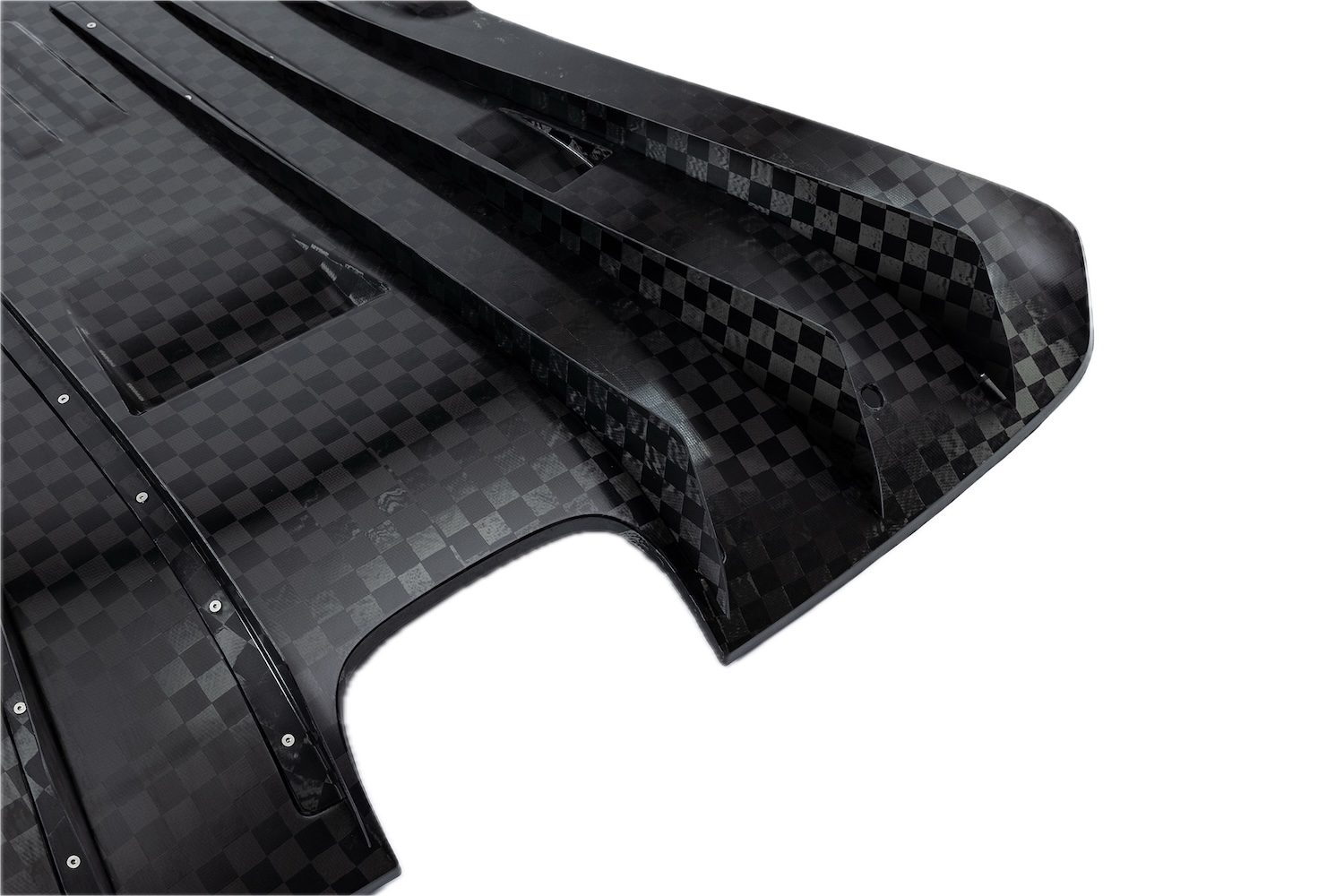 Kline Innovations carbon rear diffuser for the 992 Porsche 911 GT3RS is made from F1-grade pre-preg carbon fiber or F1-grade Textreme, featuring a wide weave checkered pattern. Textreme, a spread tow weave carbon used in F1 and aerospace engineering, provides an exceptional strength-to-weight ratio. The diffuser is autoclave cured in CAD-designed and CNC-machined molds to ensure perfect precision. Extensive testing with Computational Fluid Dynamics has fine-tuned its aerodynamic performance. Finished in a superior gloss polished coat, the carbon rear diffuser showcases the beauty of its weave, a testament to Kline Innovation’s advanced motorsport-grade manufacturing process.