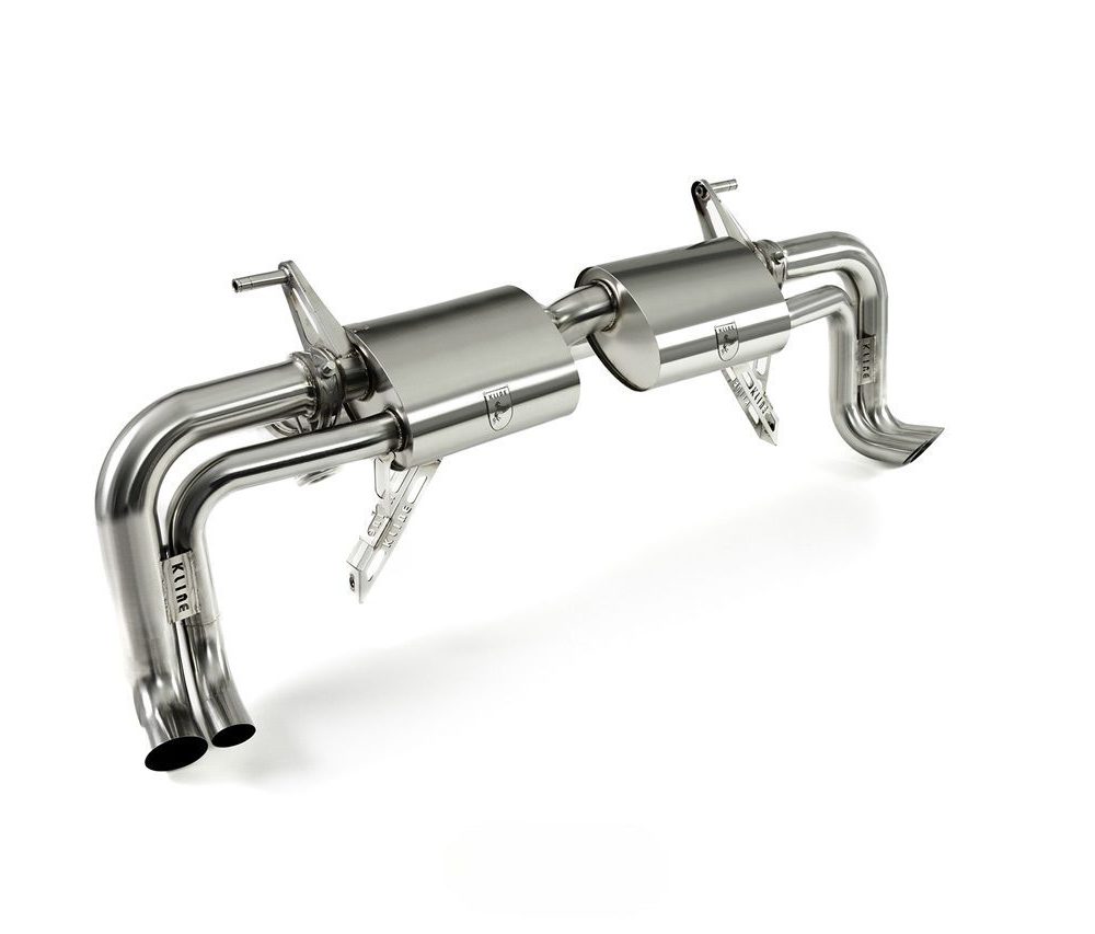 • Through the integration of Kline’s renowned innovations, which include the meticulously crafted x-pipe geometry responsible for their acclaimed and exhilarating engine sound, the exhaust system also incorporates a valvetronic system. This advanced technology allows for a serene driving experience during cruising, while unleashing a thrilling, high-pitched, and aggressively resonant vocalization when the valves open. When the valves are closed, the exhaust gases are skillfully redirected through a series of chambers and acoustic sections, effectively eliminating any cabin noise and drone. However, upon opening the valves, the exhaust system seamlessly transitions into a completely unrestricted flow, optimizing both performance and sound. The gases flow exclusively through the distinctive x-pipe, expertly enhancing the exhaust note with an elevated pitch.