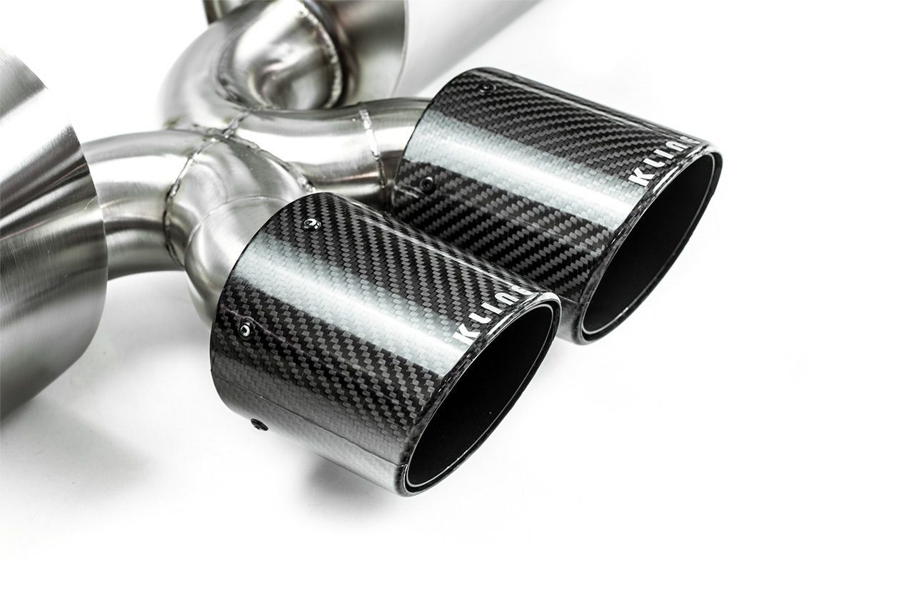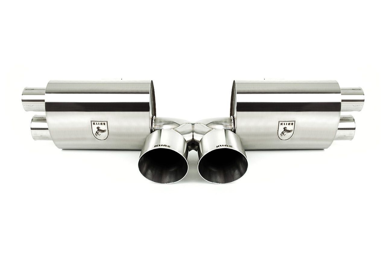 • Beginning with the manifolds, replacing the factory cats with their 100 cell or long tube Inconel headers significantly augments the sound. The gases are then routed through one of two channels. When the valve is closed, the gases flow through their harmonically tuned, internally ceramic-insulated wing silencers, eliminating unwanted drone during highway cruising. The gases then pass into the center muffler and finally through their signature 1D CLR x pipe, providing a very civilized car sound when desired. When the valve is open, the wing and center silencers are bypassed completely, allowing the gases to flow unrestricted through the exhaust system. The Kline 1D CLR X pipe’s geometry notably increases the exhaust pitch, culminating in a raucous yet beautiful, explosive roar without any obstruction to the gas transit. Inconel 625, the material used, also imparts a unique sound, further enhancing the inherent characteristic sound of the Kline system. Its sidewall is exceptionally thin, resonating to produce an even higher pitched scream at high revs.