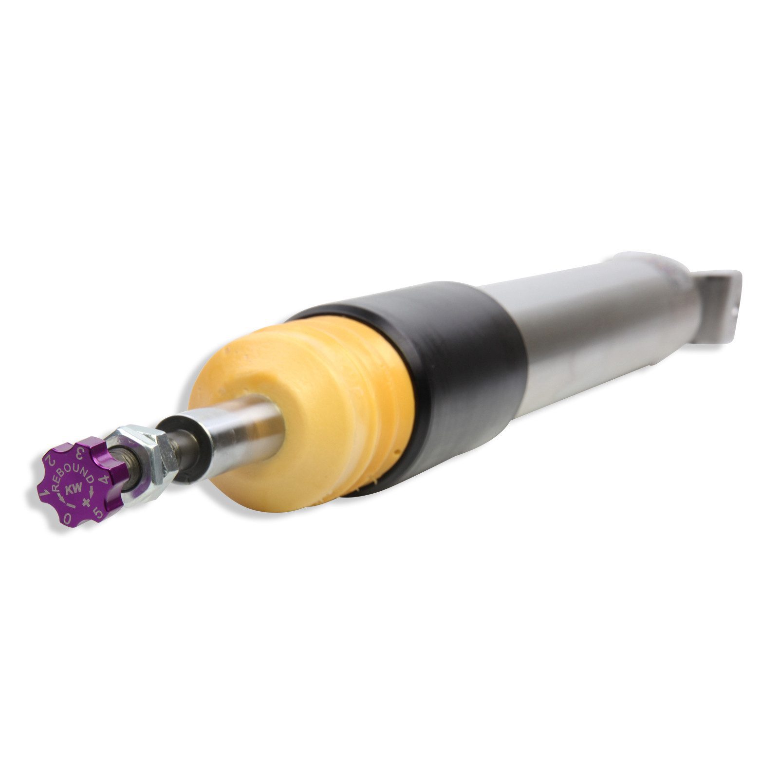 With 12 precise clicks, the KW V3 coilovers utilize TVC-A (Twin Valve Compression – Adjustable) technology and can increase or decrease the flow of valve to achieve either more or less low speed compression damping. During sudden high speed impulses the spring loaded needle valve and the spring loaded main valve open to their maximum valve cross section, acting as a digressive blow-off characteristic to avoid transmitting undesired forces through the suspension into the chassis. This provides a better platform for the vehicle body and at the same time offers more comfort than with conventional valve technology during high wheel acceleration. The dampers come preset to our baseline shock settings right out of the box providing an optimal starting place for your car while providing a wide adjustment window for true performance optimization.