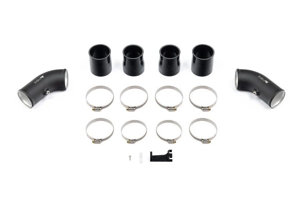 The MMX Performance High-Flow Charge Pipe Kit for BMW F10 M5 and F1x M6 models with the S63 engine is engineered to enhance performance, reliability, and under-hood aesthetics. The factory plastic pipework on these vehicles is prone to splitting or cracking under increased boost pressure — a common failure point that this aluminum upgrade eliminates. Constructed from lightweight, mandrel-bent aluminum and CFD-optimized for smooth, unrestricted airflow, these charge pipes maintain structural integrity under load and vacuum. The improved flow dynamics lead to sharper throttle response and increased power potential. Finished in a durable crinkle black coating with laser-etched MMX branding, the pipes offer a clean, high-performance appearance. The complete kit includes two turbo-side charge pipes, each with a pre-welded 1/8” NPT bung for methanol or water injection, along with four silicone couplers, a C-clip, and all necessary jubilee clamps for easy, direct-fit installation.