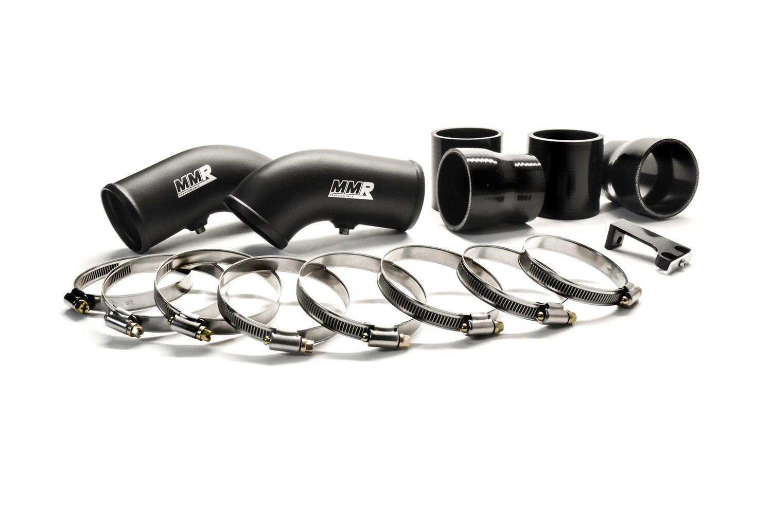 MMX Performance’s High-Flow Charge Pipe Kit for F10 M5 and F1x M6 (S63 engine) replaces the weak factory plastic pipes with durable, mandrel-bent aluminum for improved airflow, throttle response, and boost reliability. Finished in crinkle black with laser-etched branding, the kit includes turbo-side pipes with 1/8” NPT bungs, silicone couplers, and all hardware for a direct-fit installation.
