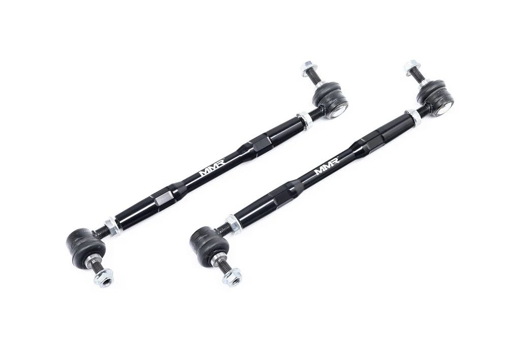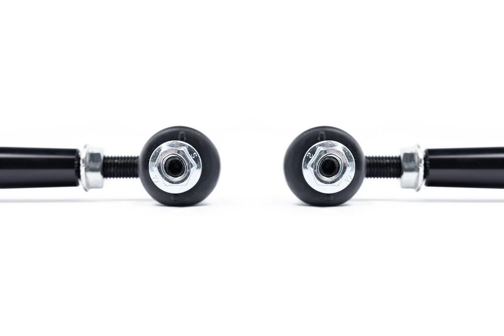 MMX Performance Front Adjustable Sway Bar End-Links for the Fxx BMW 1 Series, 2 Series, 3 Series, and 4 Series are designed to correct front anti-roll bar geometry on lowered vehicles. The original fixed-length end-links are suited for factory ride height, but lowering alters their angle, reducing effectiveness and increasing stress on suspension components. MMX addresses this with roughly 30mm of adjustability and opposing left / right threaded ends, allowing precise, preload-free alignment of the anti-roll bar. Featuring Teflon-lined, motorsport-grade ball joints, these end-links provide more direct steering response and reduced deflection compared to OE rubber bushings. Each unit is CNC-machined from 6061-T2 aluminum and finished in a durable Dark Anthracite anodized coating, with integrated rubber dust boots to protect the joints from contaminants and extend service life.