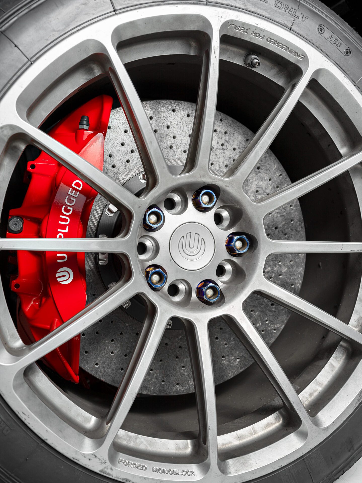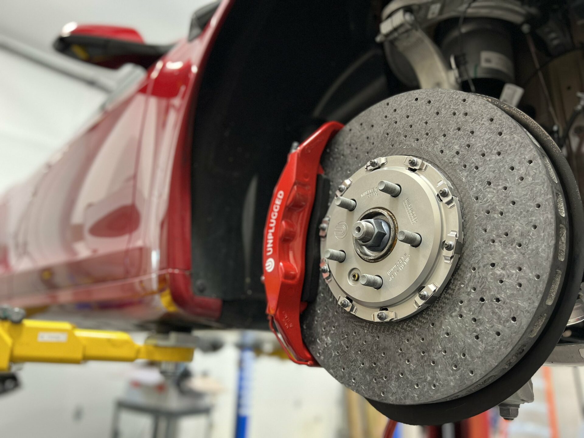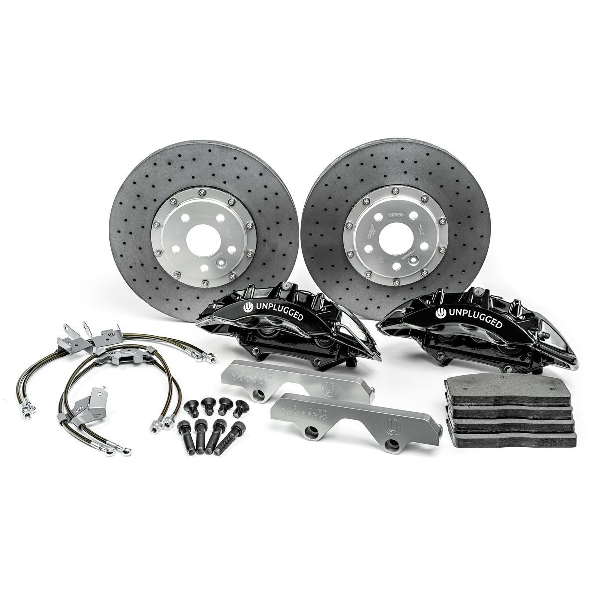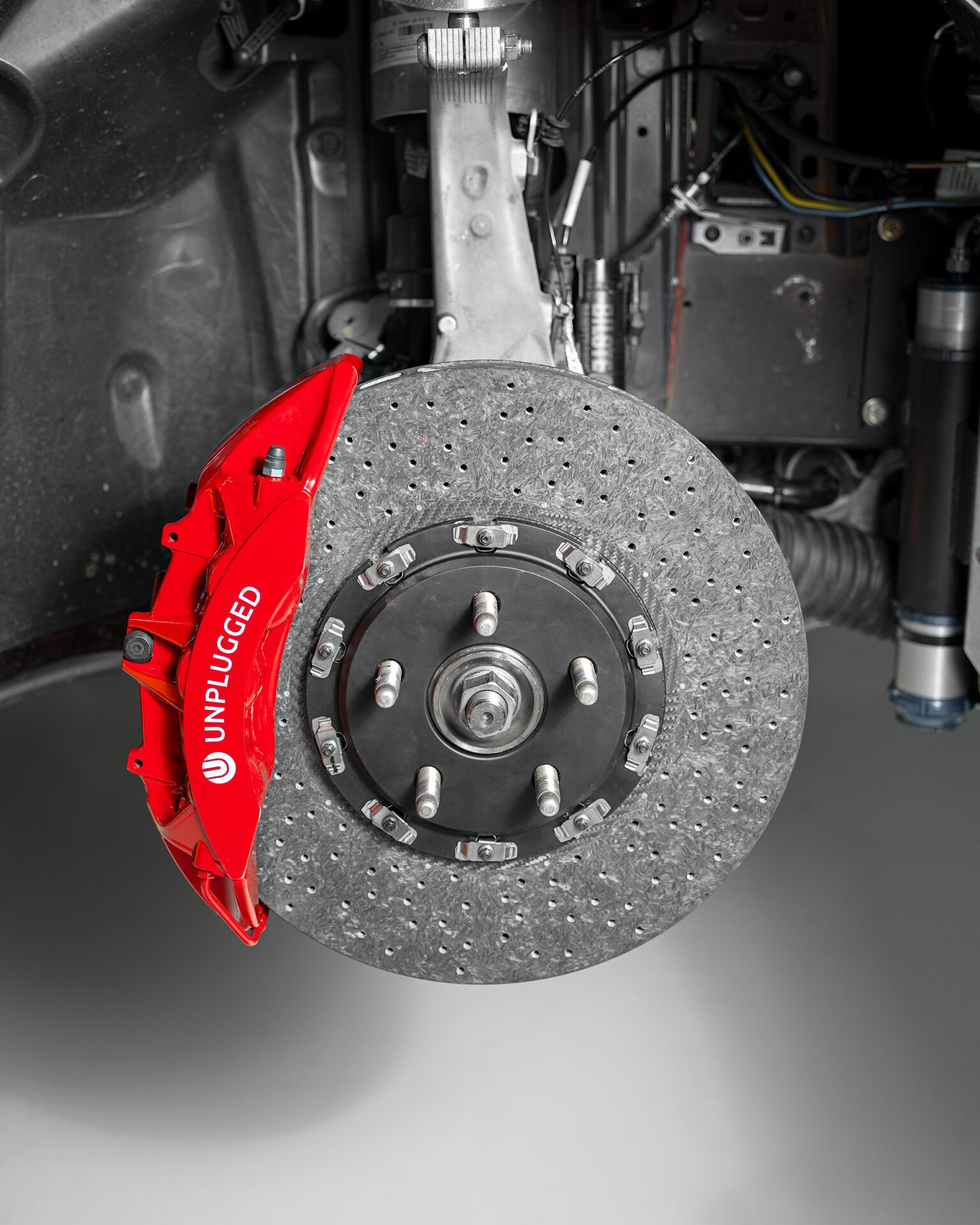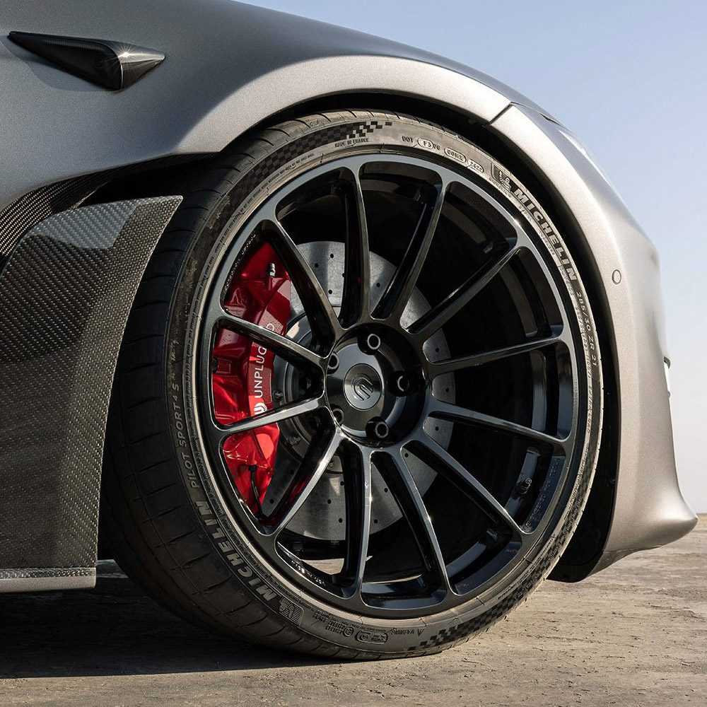 The Tesla Model S Plaid is one of the fastest street cars on earth and decelerating 5000 lbs quickly, repeatedly and with consistent driver confidence is a big challenge. Pushing your Plaid anywhere near its limits requires a braking system that can take a beating from high-weight-high-g-force stops exerting incredible forces repeatedly. The Unplugged Performance Carbon-Ceramic Front Big Brake Kit (BBK) is designed to significantly increase this capacity. It accomplishes the various motorsports records and thrilled street user feedback it has received by providing a 93% increase in pad/rotor surface contact, significantly higher thermal capacity hardware, and custom-tailored brake pad compounds to provide the highest possible operating range temperature and pedal feel. It also happens to be significantly lighter in unsprung weight which brings advantages in feel, efficiency, and handling response.