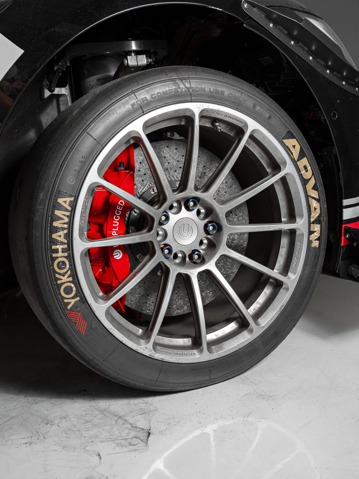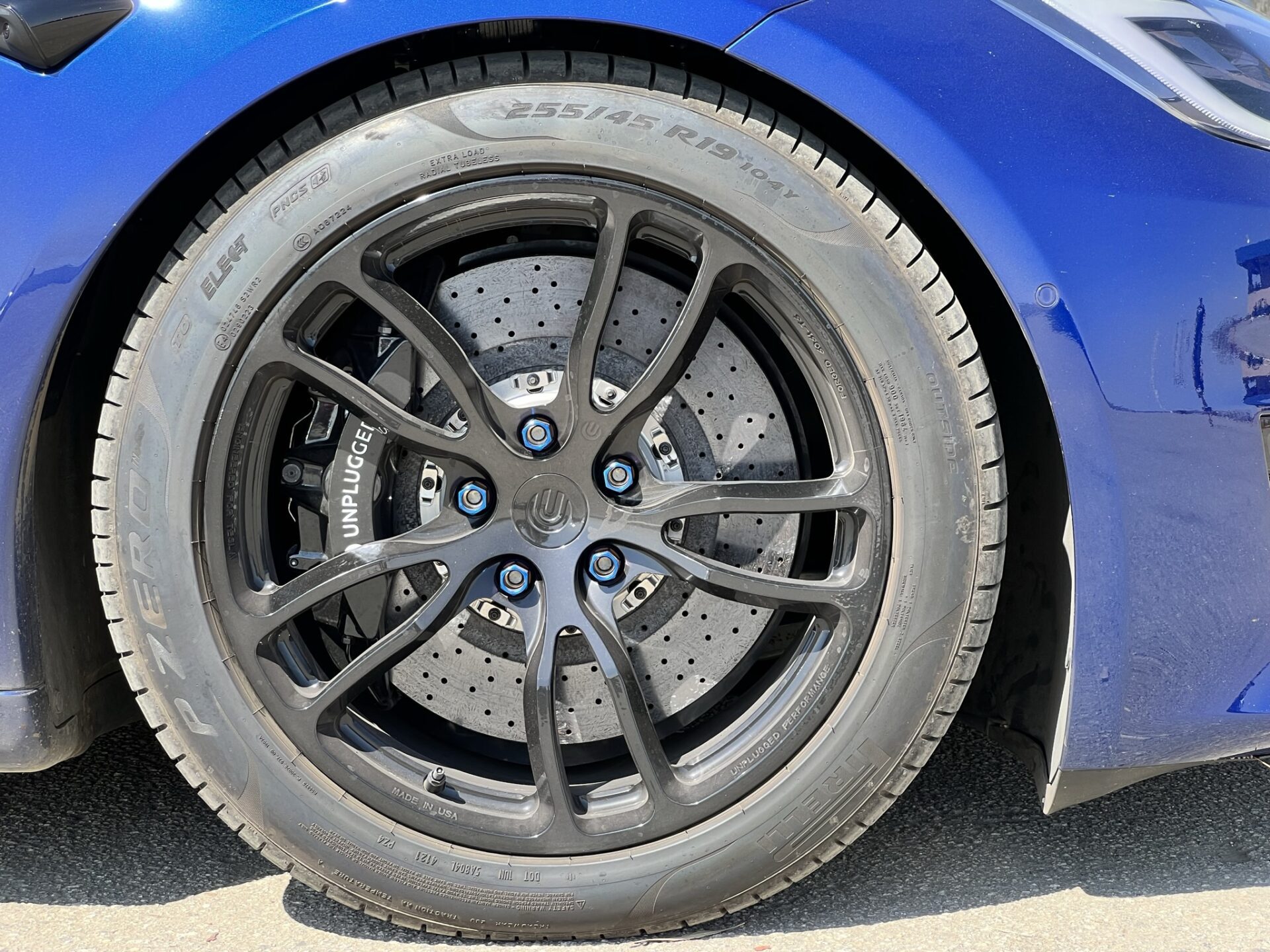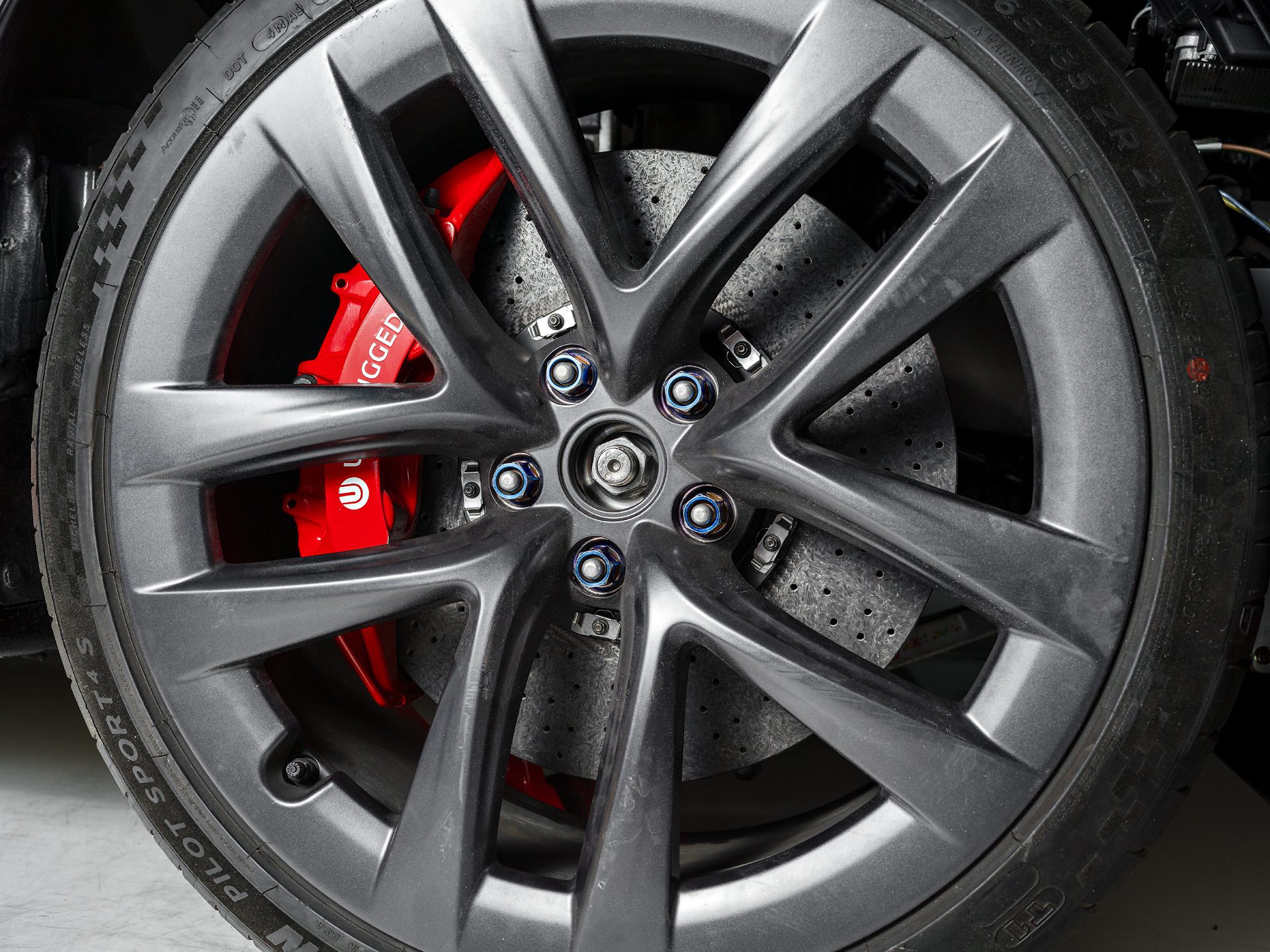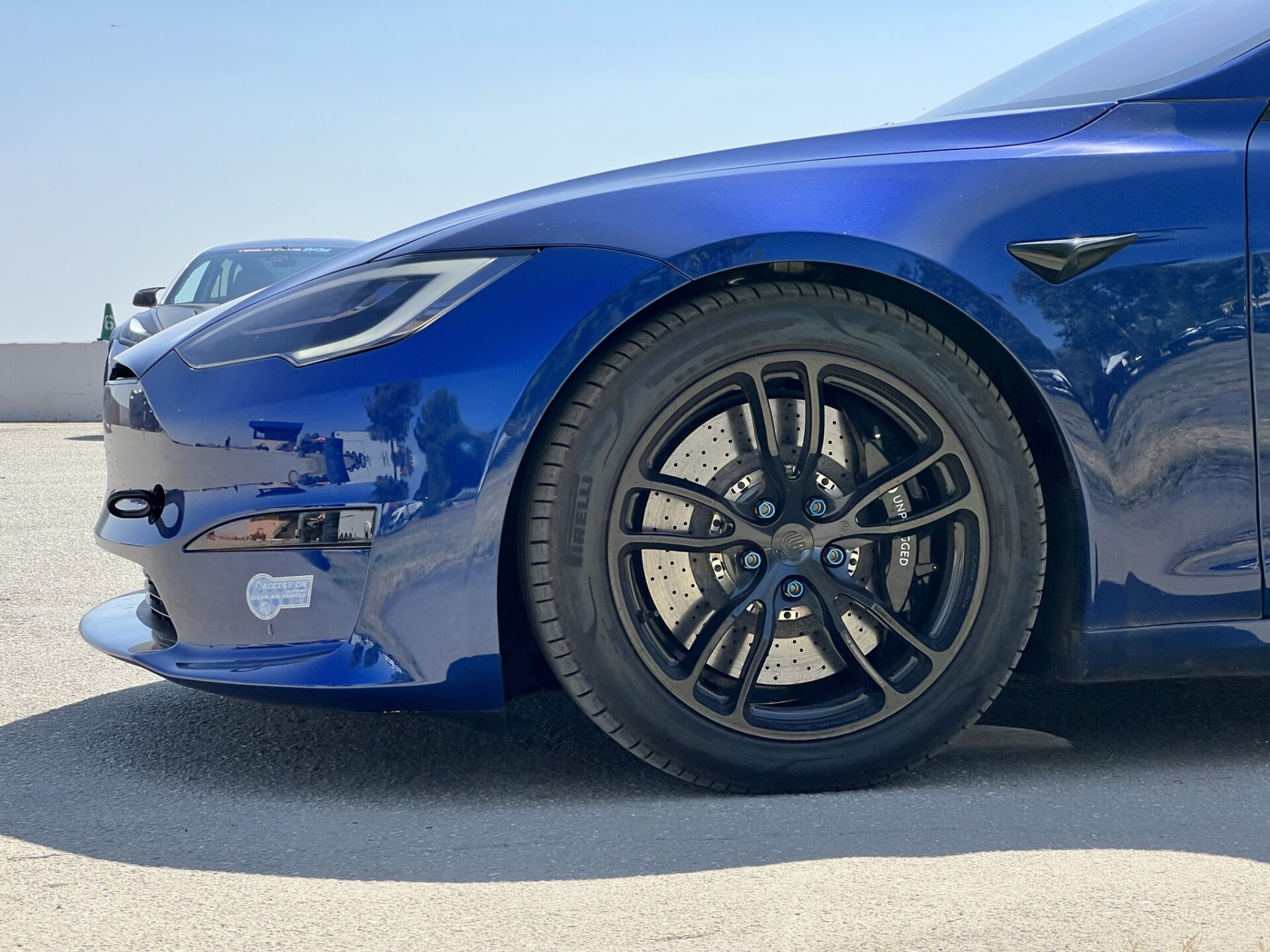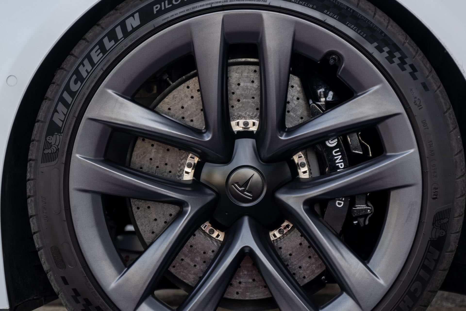 The Tesla Model S Plaid is one of the fastest street cars on earth and decelerating 5000 lbs quickly, repeatedly and with consistent driver confidence is a big challenge. Pushing your Plaid anywhere near its limits requires a braking system that can take a beating from high-weight-high-g-force stops exerting incredible forces repeatedly. The Unplugged Performance Carbon-Ceramic Front Big Brake Kit (BBK) is designed to significantly increase this capacity. It accomplishes the various motorsports records and thrilled street user feedback it has received by providing a 93% increase in pad/rotor surface contact, significantly higher thermal capacity hardware, and custom-tailored brake pad compounds to provide the highest possible operating range temperature and pedal feel. It also happens to be significantly lighter in unsprung weight which brings advantages in feel, efficiency, and handling response.