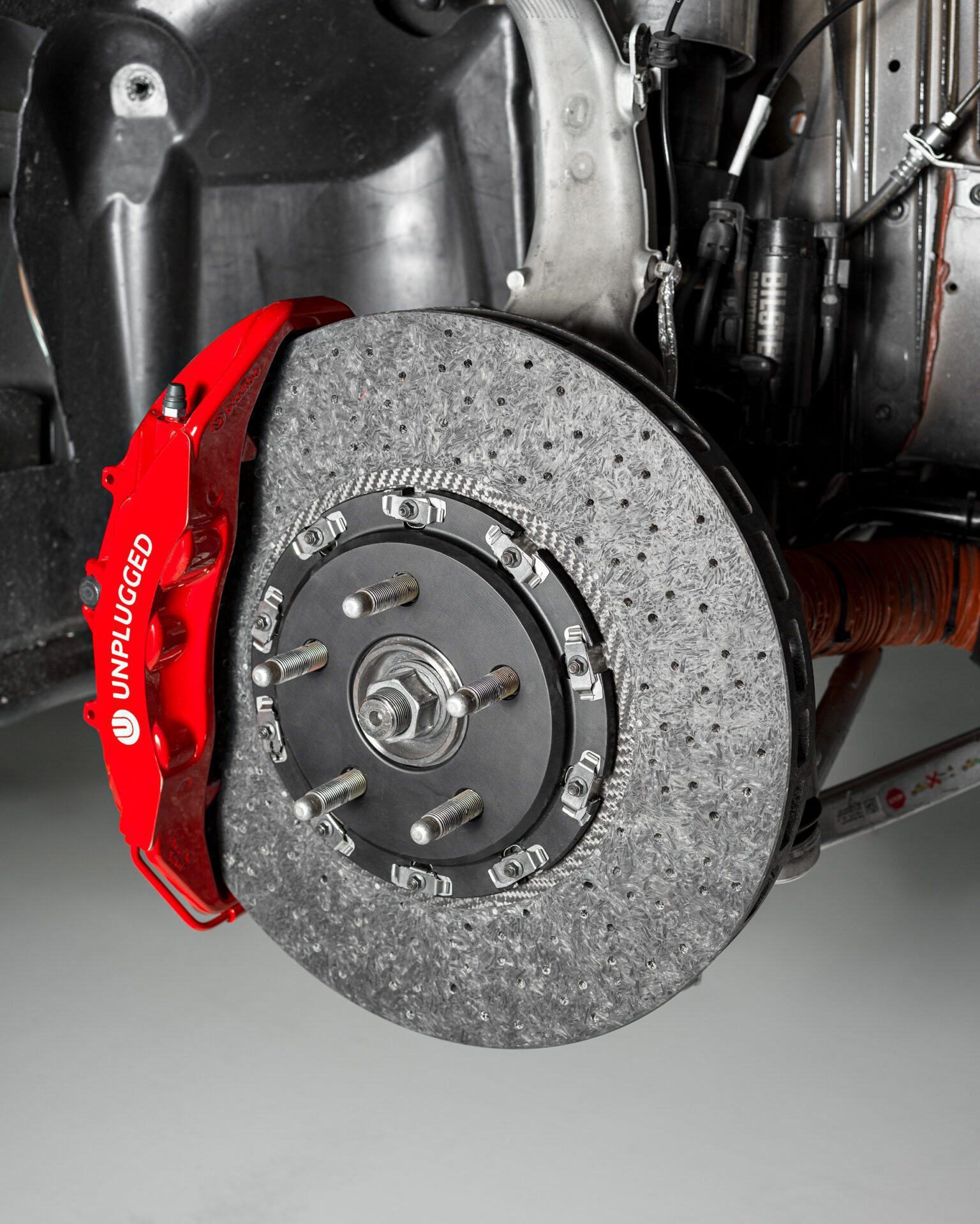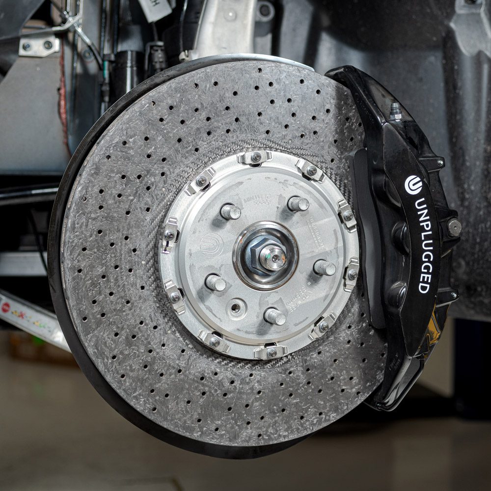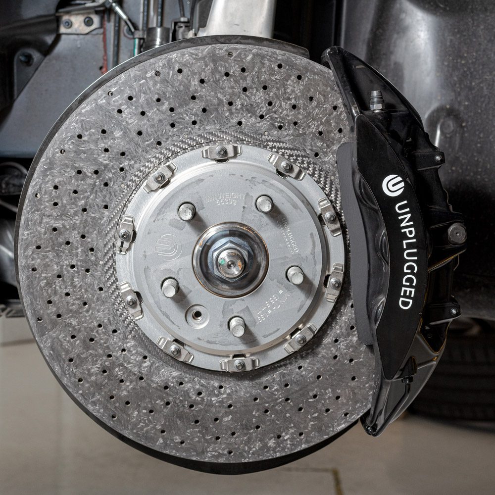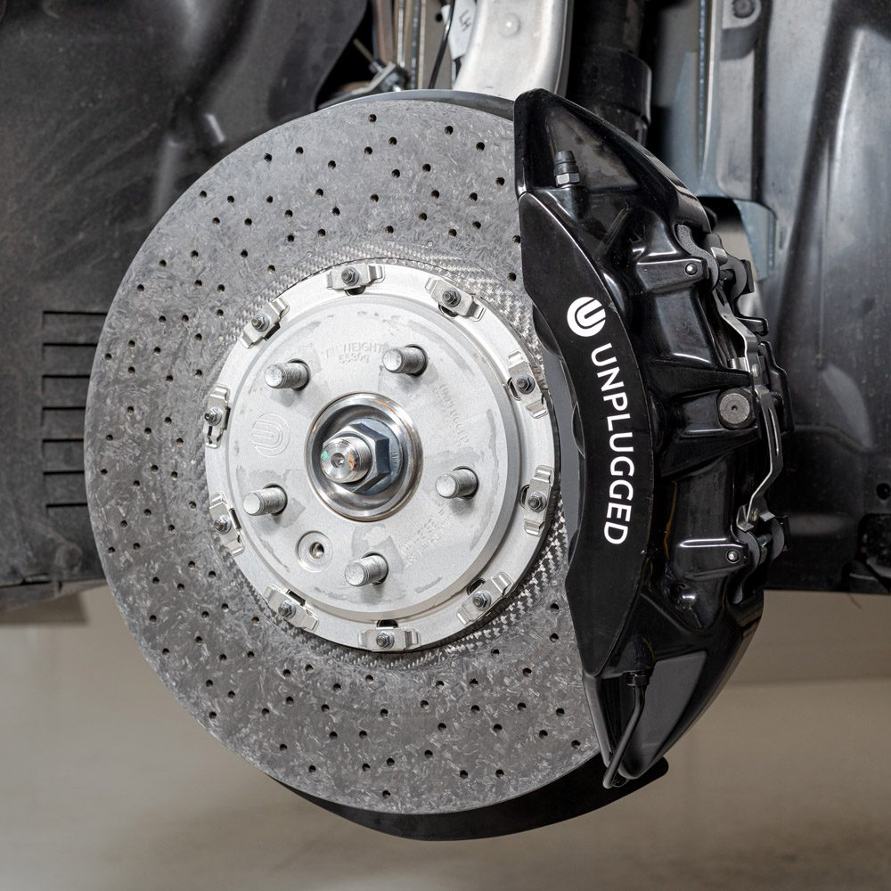 Carbon ceramic braking technology is leveraged by modern hypercars and supercars to provide the ultimate in stopping power, combined with the unique characteristics of carbon which include lightweight, light-wearing, and long component life. Early-generation carbon-ceramic rotors from manufacturers such as Ferrari and Porsche earned a reputation for being squeaky and cranky in cold weather, these problems have been overcome with the latest generation carbon-ceramic technology. We are proud to say that our carbon-ceramic brake systems are quieter than any iron system we have tried with performance pads and perform well in all conditions from boiling hot track days to frozen mountain roads.