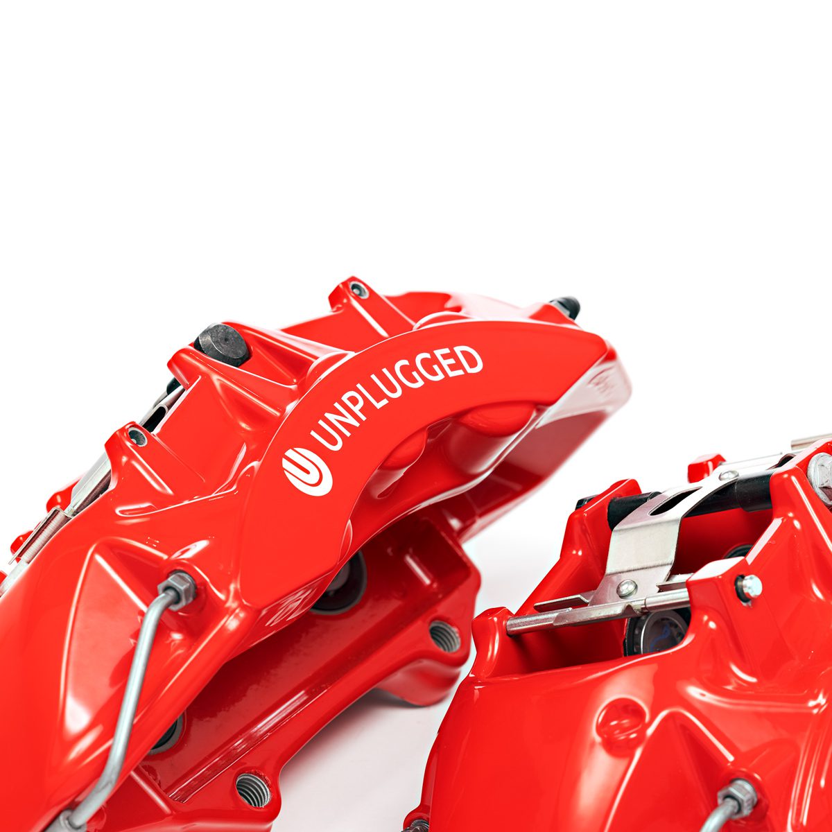 The Tesla Model S Plaid is one of the fastest street cars on earth and decelerating 5000 lbs quickly, repeatedly and with consistent driver confidence is a big challenge. Pushing your Plaid anywhere near its limits requires a braking system that can take a beating from high-weight-high-g-force stops exerting incredible forces repeatedly. The Unplugged Performance Carbon-Ceramic Front Big Brake Kit (BBK) is designed to significantly increase this capacity. It accomplishes the various motorsports records and thrilled street user feedback it has received by bringing a 93% increase in pad/rotor surface contact, significantly higher thermal capacity hardware, and custom-tailored brake pad compounds to provide the highest possible operating range temperature and pedal feel. It also happens to be significantly lighter in unsprung weight which brings advantages in feel, efficiency, and handling response.
