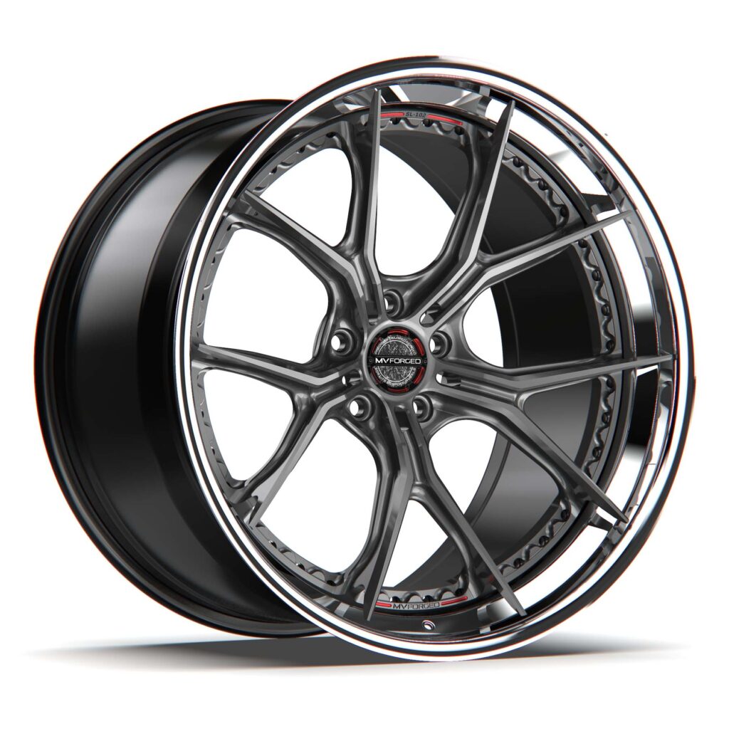 The Spoke-Lite® range, positioned as the pinnacle of MV Forged’s wheel collections, epitomizes a fusion of advanced technical knowledge and precision. This line, embodying the perfect blend of style and functionality, includes each wheel adorned with the patented Spoke-Lite® register, featuring unique cut-through bolt flange pockets that not only accentuate the outer lip’s color but also aid in reducing the wheel’s center mass. The collection is recognized for its harmonious integration of aesthetics and performance, marked by full 360-degree surfacing and intricate engineering that echoes the essence of supercar design. The series is further distinguished by 4 Piece Spoke-Lite® caps, complete with standard titanium bolts, and either twill or forged carbon logos, showcasing cut-through detailing. This series is a testament to the zenith of custom wheel craftsmanship. Their flagship configuration boasts a 3-piece construction, engineered with deep concave profile forgings and a novel “floating spoke” extension. This unique design allows for spokes that contour precisely with the step lip surface, creating an unparalleled look in the market.