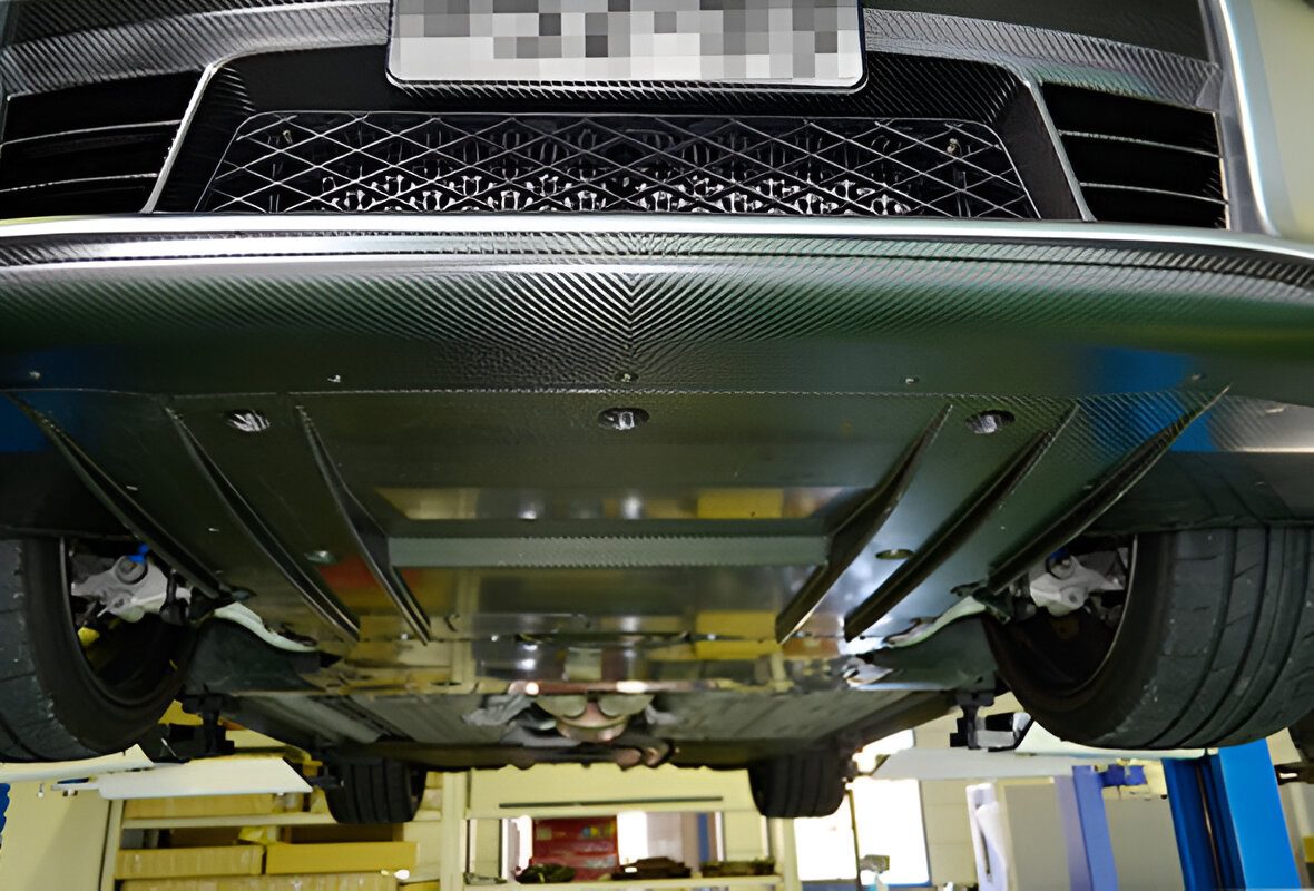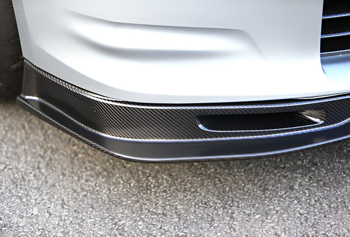 Compared to previous carbon lips, the tip has been extended by approximately 15mm, and the sides by 35mm, combining the elegance and strength of dry carbon. Additionally, the enlarged central opening increases the airflow under the car, while the six rectifying fins on the under panel and the air dam effect further enhance downforce.