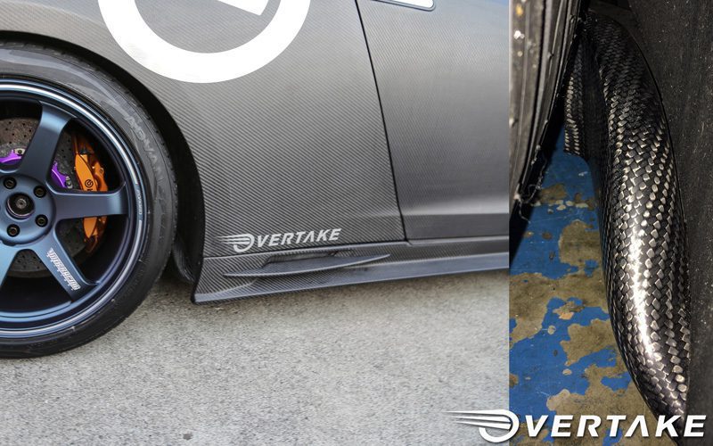 Designed by Overtake to add visual presence and rear brake ducting. These revised side skirts feature a more aggressive shape and include full carbon fiber brake ducting to send cooling towards the rear brakes for heavy track use. Made out of a dry carbon twill and will reduce the weight by 25% compared to the stock side skirts.