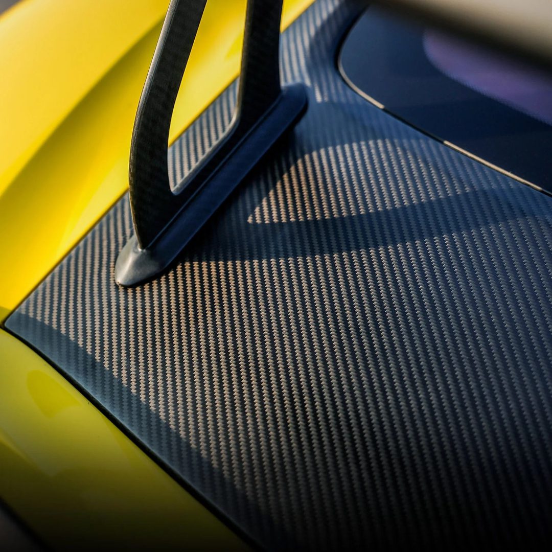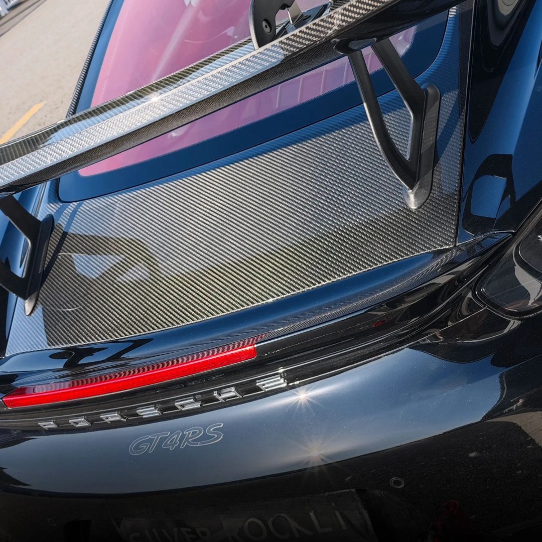 Silver Rocket’s V-Frame Tailgate with Lightweight Glass for the 981 and 982 Porsche Boxster and Cayman is a purpose-built upgrade designed to deliver exceptional aerodynamic performance and weight reduction. Constructed from aerospace-grade dry carbon fiber, the tailgate sheds 20.7lbs compared to the OEM Cayman tailgate and wing assembly. The integrated Super Strong V-Frame and honeycomb core provide the structural strength to support backward-extended wing setups and manage downforce loads with outstanding stability. Engineered to complement the carbon fiber aesthetics of the GT4 RS Weissach Pack, the system also includes Silver Rocket’s HD lightweight polycarbonate glass—an impact-resistant alternative to the factory’s fragile thin rear glass. Fully compatible with OEM GT4 RS wing supports and Silver Rocket’s dry carbon wing risers, the tailgate is also available in a touring version by special order.