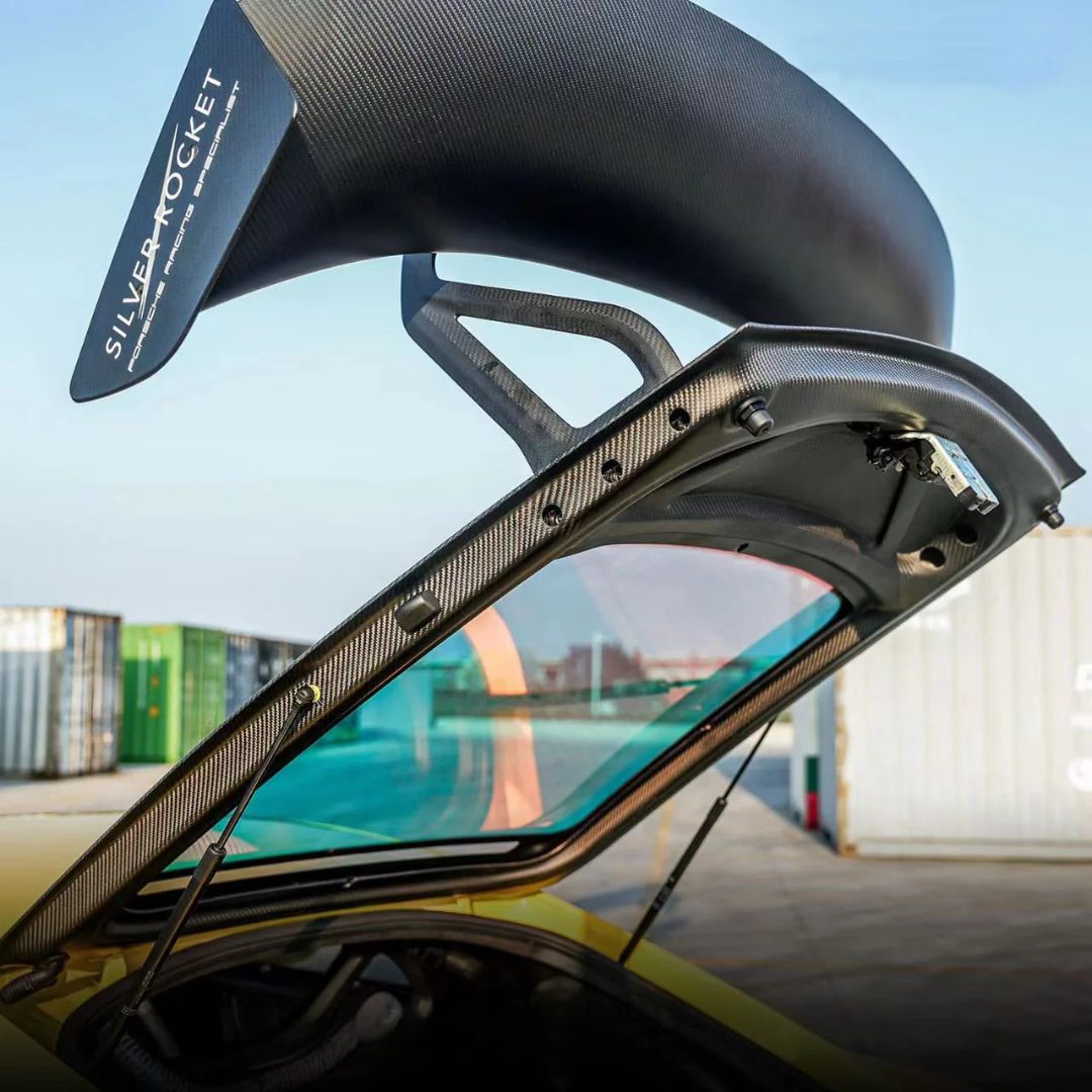 Silver Rocket’s V-Frame Tailgate with Lightweight Glass for the 981 and 982 Porsche Boxster and Cayman reduces weight by 20.7lbs while withstanding up to 600 kg of downforce, thanks to its reinforced dry carbon fiber construction. Engineered for extended wing applications and equipped with impact-resistant polycarbonate glass, it delivers exceptional strength and stability without sacrificing rear visibility.