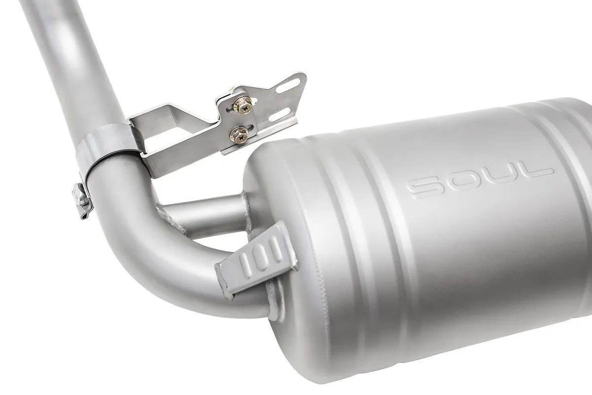 • Every system is meticulously crafted from mandrel bent T304L stainless steel tubing, ensuring superior quality and durability. The mufflers are specially designed with reinforced casings to enhance their strength and longevity. It is common for aftermarket Boxster / Cayman exhaust hangers and supports to be susceptible to cracking and failure. However, SOUL has addressed this issue by incorporating fortified brackets into their system, preventing any damage during extended street use and track days.