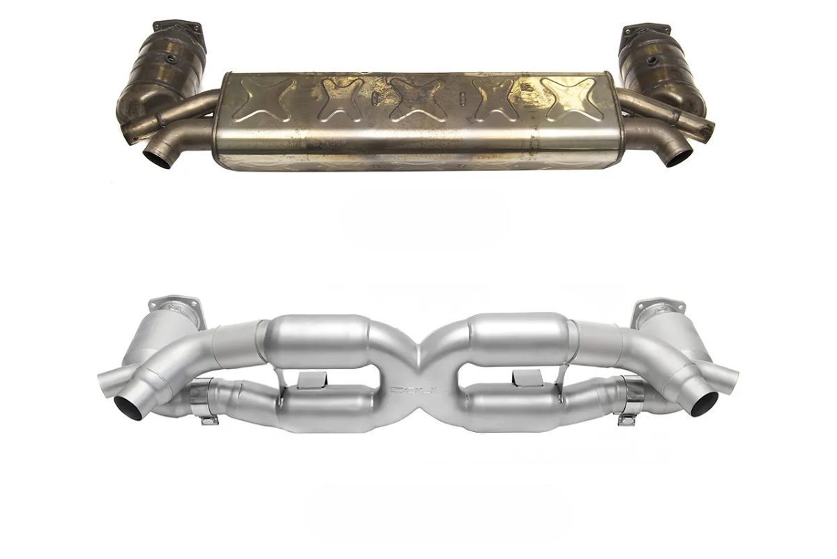 • The HJS catalytic converters exhibit exceptional flow characteristics, allowing for the passage of an increased amount of turbo and flat-six sound. The addition of quad resonators contributes to a refined tone and effectively reduces droning in the cabin. The volume level is perfectly suited for owners seeking a sophisticated sound enhancement, delivering a notably aggressive tone during heavy throttle inputs while maintaining a mild and sporty presence during cruising.