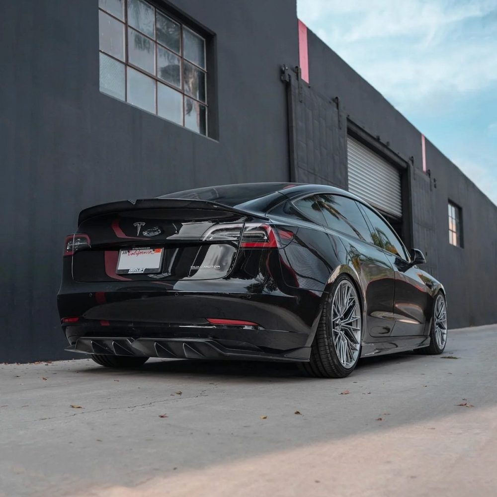 The StreetHunter Designs Rear Diffuser for the Tesla Model 3 is a full replacement for the stock plastic rear bumper under tray, adding aggressive fins and distinctive “V-notch” styling. Available in both FRP and carbon fiber options, this diffuser enhances the vehicle’s aerodynamics and visual appeal. Installation is made easy with 3M tape and hardware, providing a secure fit while transforming the look of your Tesla Model 3.