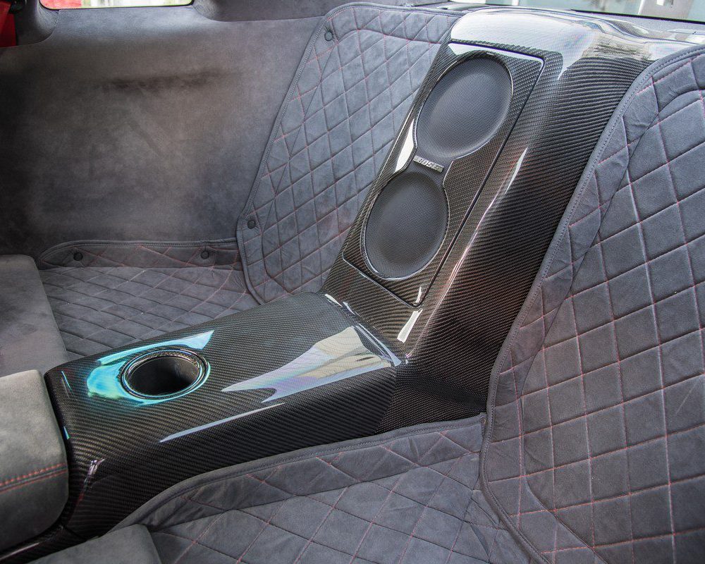 This listing is for a carbon fiber-converted OEM Subwoofer Housing / Surround for the R35 Nissan GT-R. Customers often pair the carbon-converted subwoofer surround with our carbon fiber rear armrest.
