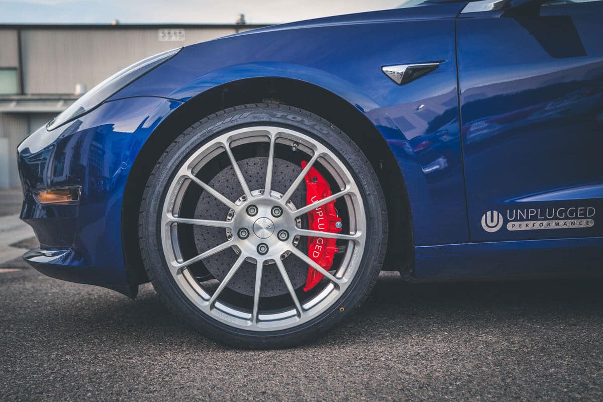 A heavy car deserves the most heavy-duty brakes available and these have stood the test of time. Unplugged Performance introduced the brake upgrade category to Tesla tuning long before the Model 3 was first released and our big brake kits have been used on daily driven and track driven Teslas ever since (S, X, 3 and Y). The world’s fastest Teslas run this kit and have become famous for their lap records at TeslaCorsa’s Buttonwillow Raceway events as well as internationally at famed tracks like Tsukuba Circuit in Japan. Most importantly, over the years there have been zero warranty replacements, zero disc re-orders (these rotors last a long time), and rave reviews by race drivers, journalists, and everyday Tesla commuters. If you’ve watched racing legend and Tesla track mode development driver Randy Pobst’s glowing reviews of these brakes you already know they work magic.