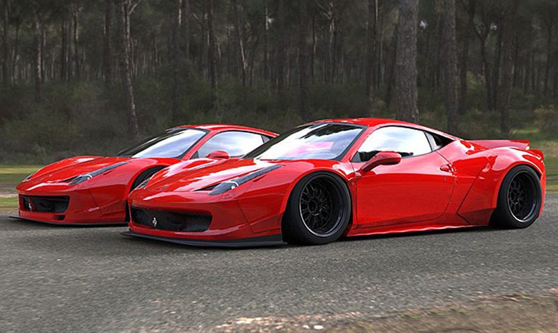 Full body kit, lip spoiler type for the Ferarri F458 Italia by Super Veloce Racing, a famous Ferrari aftermarket manufacturer in Japan. Part of the widebody kit for the Italia.
