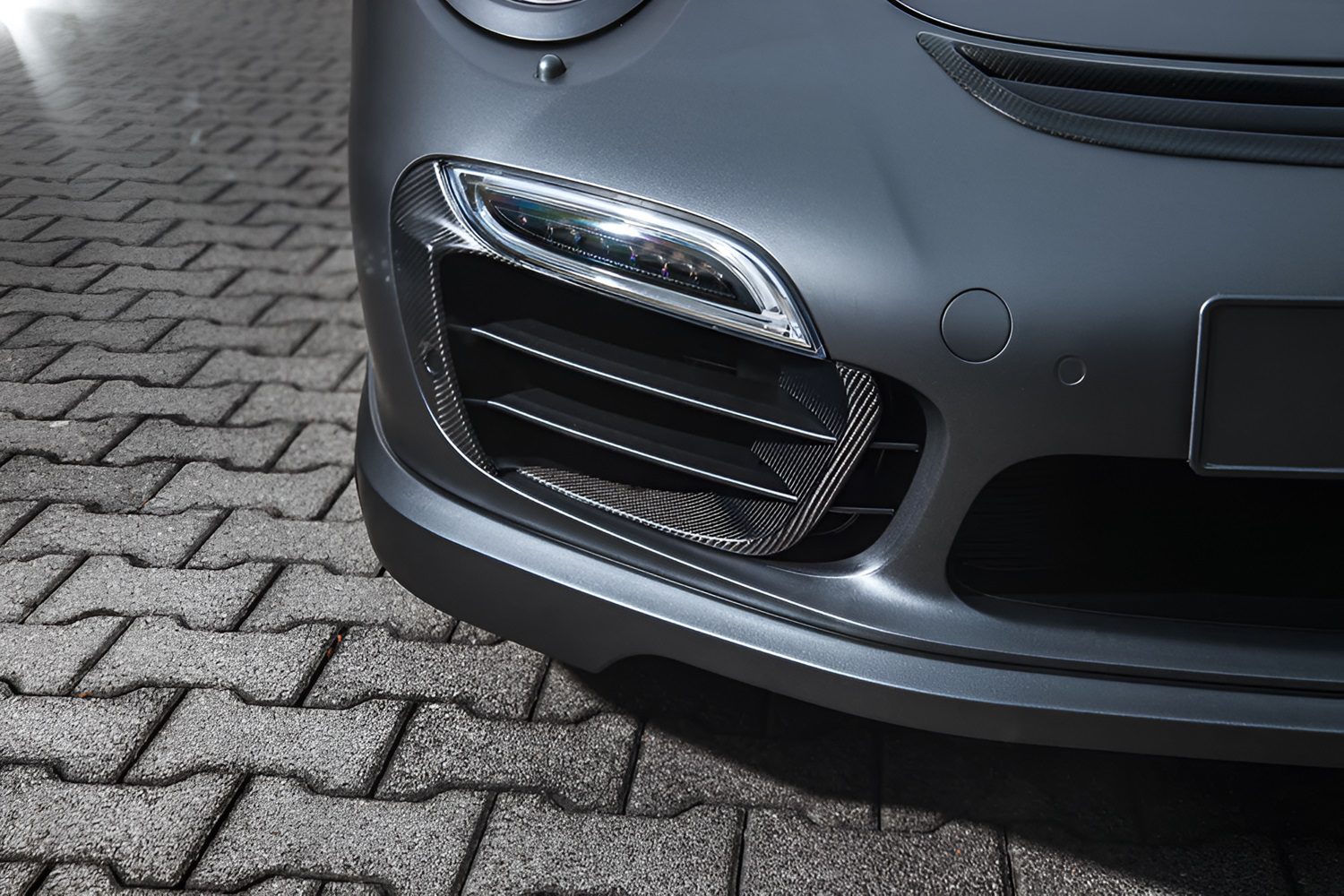 Upgrade the front-end appearance and performance of your Porsche 991.1 Turbo or Turbo S with TECHART’s Carbon Fiber Front Bumper Grille’s Airblades. Designed to replace the standard front bumper grille air inlets, these airblades are crafted from high-quality carbon fiber and are available in both glossy and matte finishes. The sleek, sporty design enhances your vehicle’s aerodynamics while maintaining compatibility with parking sensors on both sides. Tailored for 991.1 Turbo and Turbo S models up to the 2016 model year, these airblades provide a seamless, easy installation using the existing mounting points.
