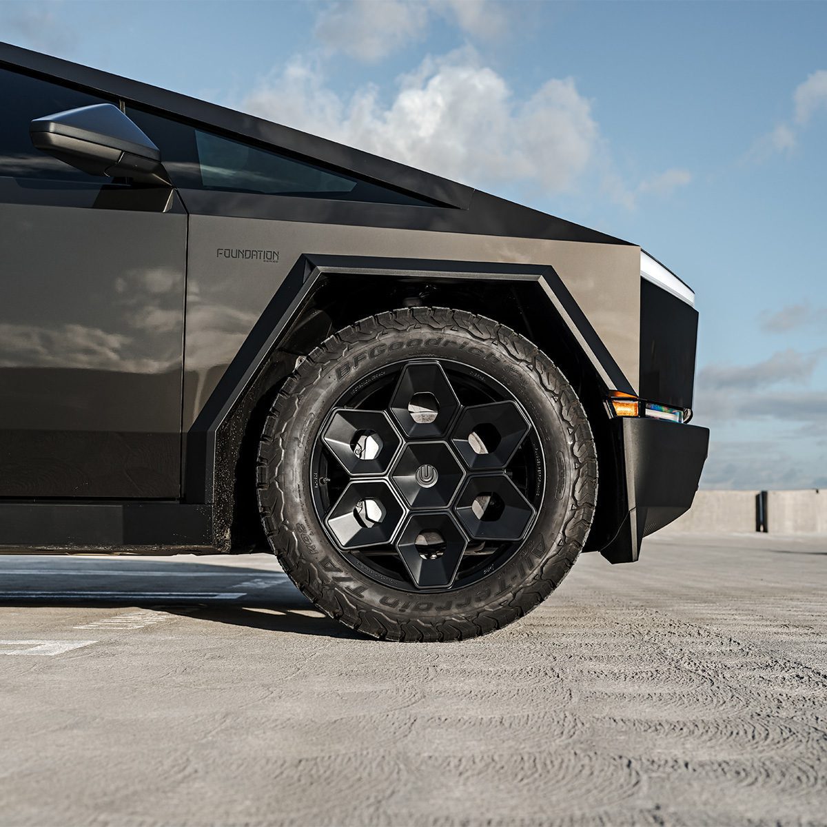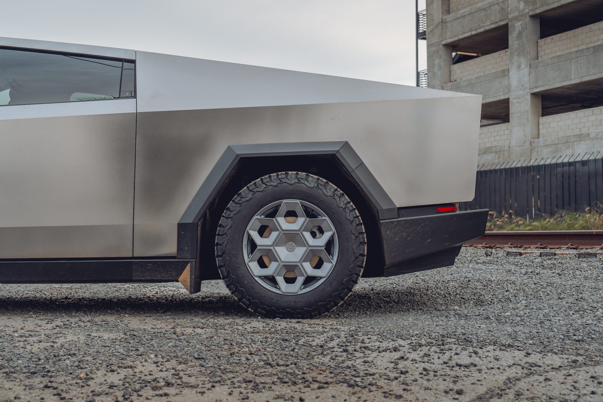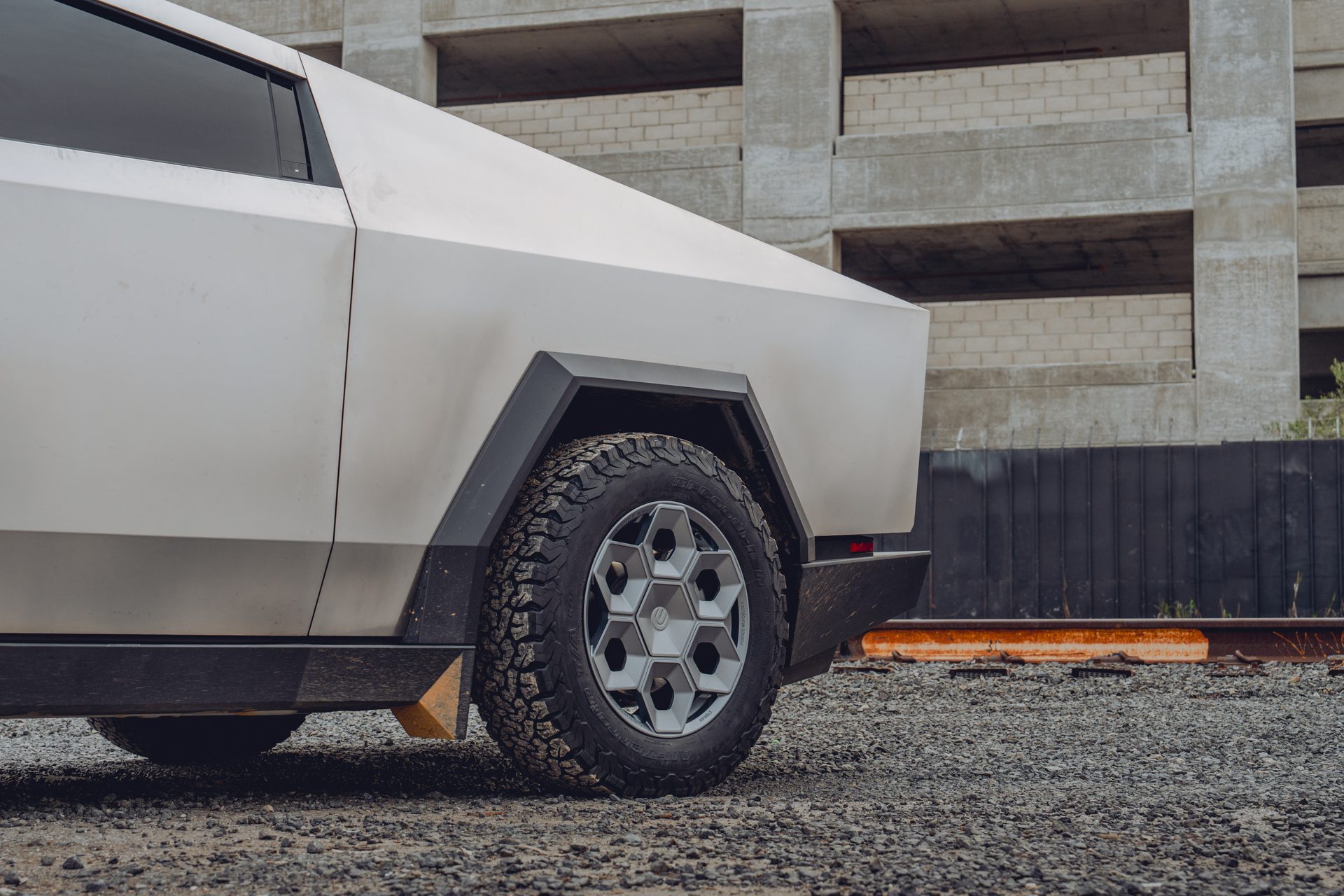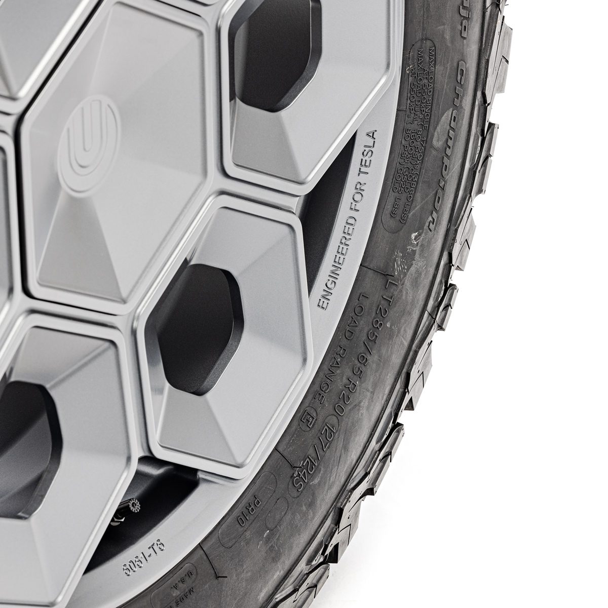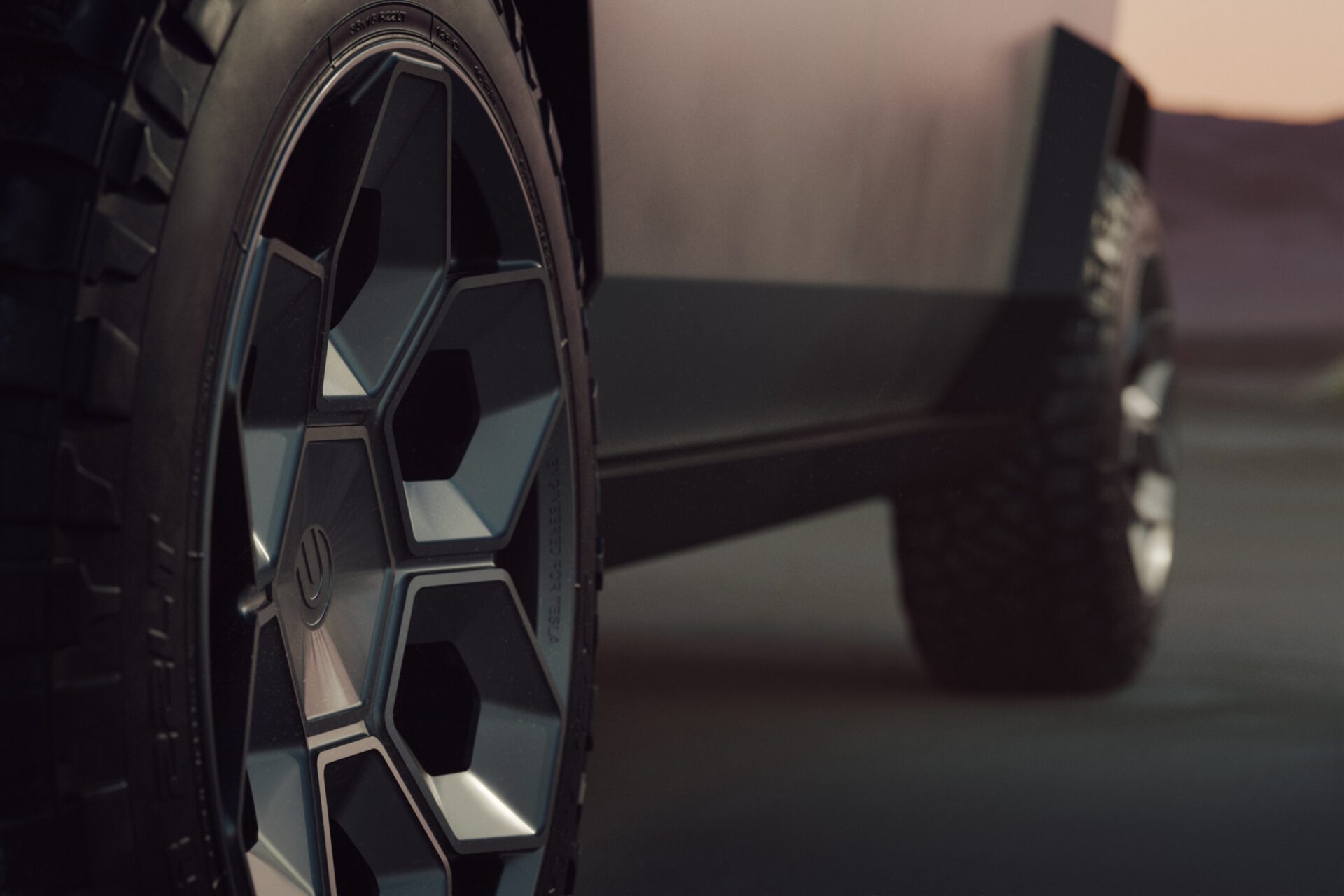 A bold new design language was introduced into the Tesla brand with the introduction of the Cybertruck. We felt it was only appropriate to develop specialized products specifically for this new era of Tesla. In our approach to this iconoclastic vehicle, we needed not only a wheel that looked right with the design visually, but a wheel that could defeat the rigors of carrying heavy loads, towing heavy loads, and will never fold in the roughest terrain on Earth, the Moon or Mars.